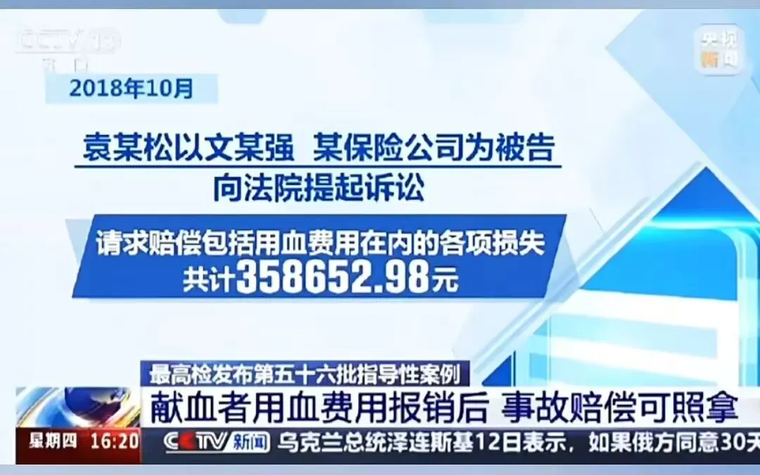 “袁某某因车祸被撞伤住院,原判决认为袁某某已享受无偿献血者用血报销政策,未将用血费用计入医疗费损失,省检察院依法抗诉获改判,推动完善无偿献血者用血费用报销后侵权人仍需赔偿的司法规则,入选最高检第五十六批指导性案例。”