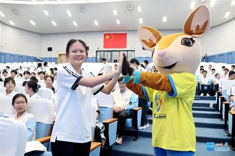 上海外国语大学三亚附属中学学生与三亚亚沙会吉祥物“亚亚”互动。