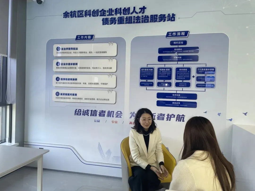 针对余杭区科创企业、科创人才聚集的特点,2025年9月28日,区法院启用全省首个科创企业科创人才债务重组法治服务站,该服务站集专业咨询、价值识别、程序衔接、投融资助力和普法宣传等功能于一体,依托专业的管理人志愿者队伍,为陷入债务困境的科创企业和人才提供庭外重组、和解、预重整和个人债务集中清理程序辅导等服务,打造困境科创企业与人才重获新生的“第一站”。