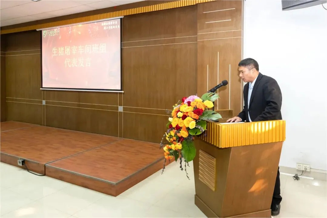 生猪屠宰车间班组代表汇报,以技能培训与安全生产教育强化合规意识,对标标准完成生产,保障产品质量稳定。