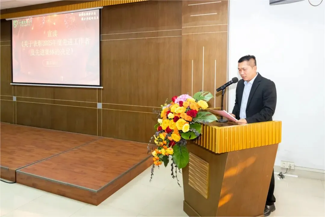 会议宣读《关于表彰2025年度先进集体及先进工作者的决定》,激励全体员工以先进为榜样,爱岗敬业、勇于担当。