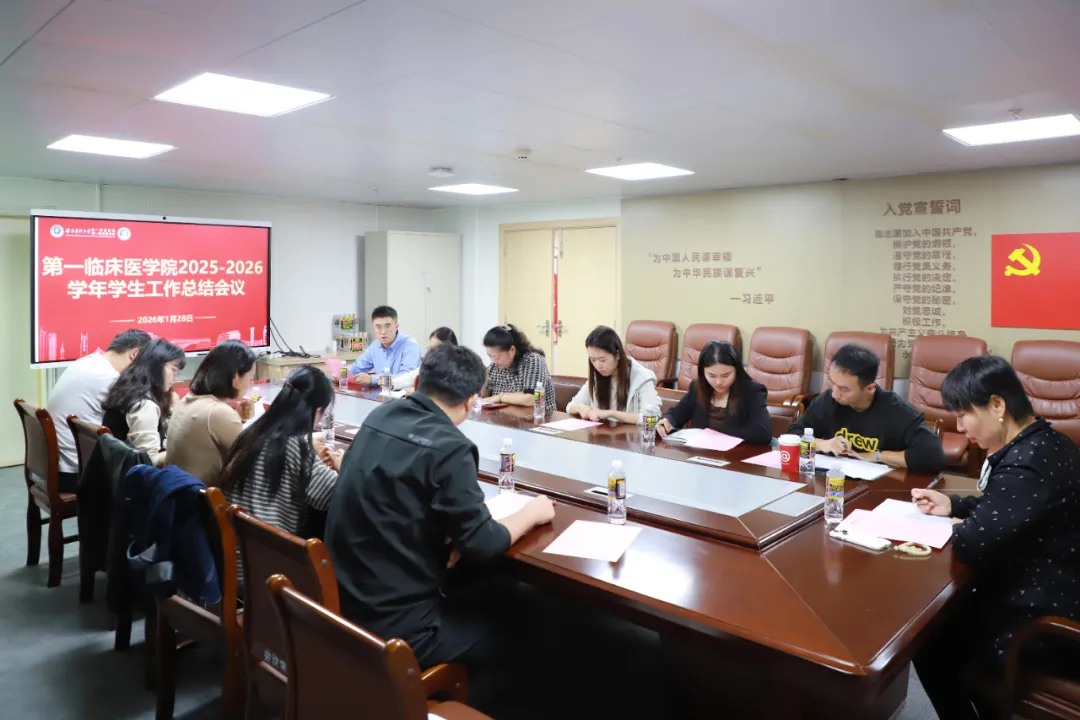 会议伊始,由赖信翔作第一临床医学院2025-2026学年学生工作总结汇报。他全面回顾了本学年学生工作开展情况,从学生日常管理措施、学风建设成效、推优保研成果、就业落实情况以及特色活动开展、家校协同育人等方面进行总结,同时深入分析辅导员年度考核结果、学生期末考试成绩以及学生思政教育、学业帮扶效能方面的不足与改进之处,并对下一学期学生工作的重点任务进行部署安排。