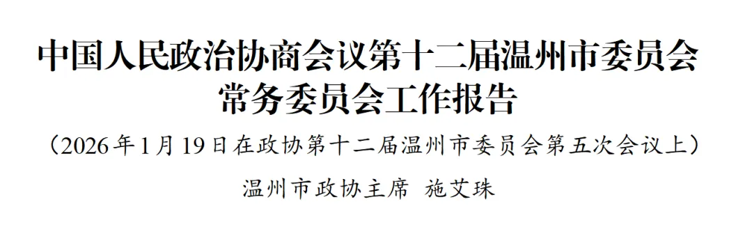 2025年是“十四五”规划的收官之年。一年来,在中共温州市委的坚强领导和省政协的有力指导下,十二届市政协及其常委会坚持以习近平新时代中国特色社会主义思想为指导,深入学习贯彻习近平总书记关于加强和改进人民政协工作的重要思想,紧紧围绕中央和省市委各项决策部署,深入践行全过程人民民主,充分发挥专门协商机构作用,着力打造同心政协、有为政协、温暖政协、活力政协、书香政协,在奋力谱写中国式现代化温州新篇章中凝聚政协智慧、贡献政协力量。