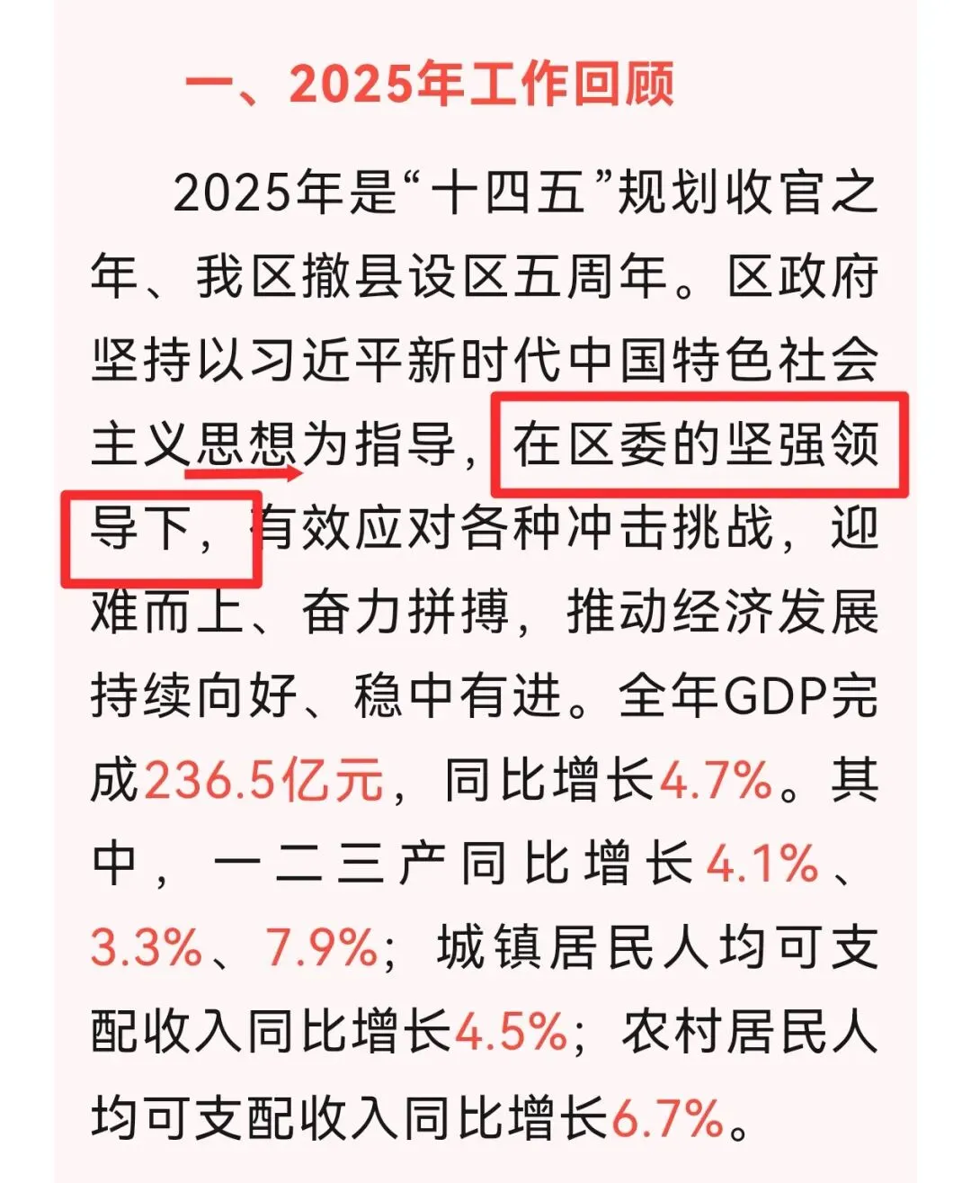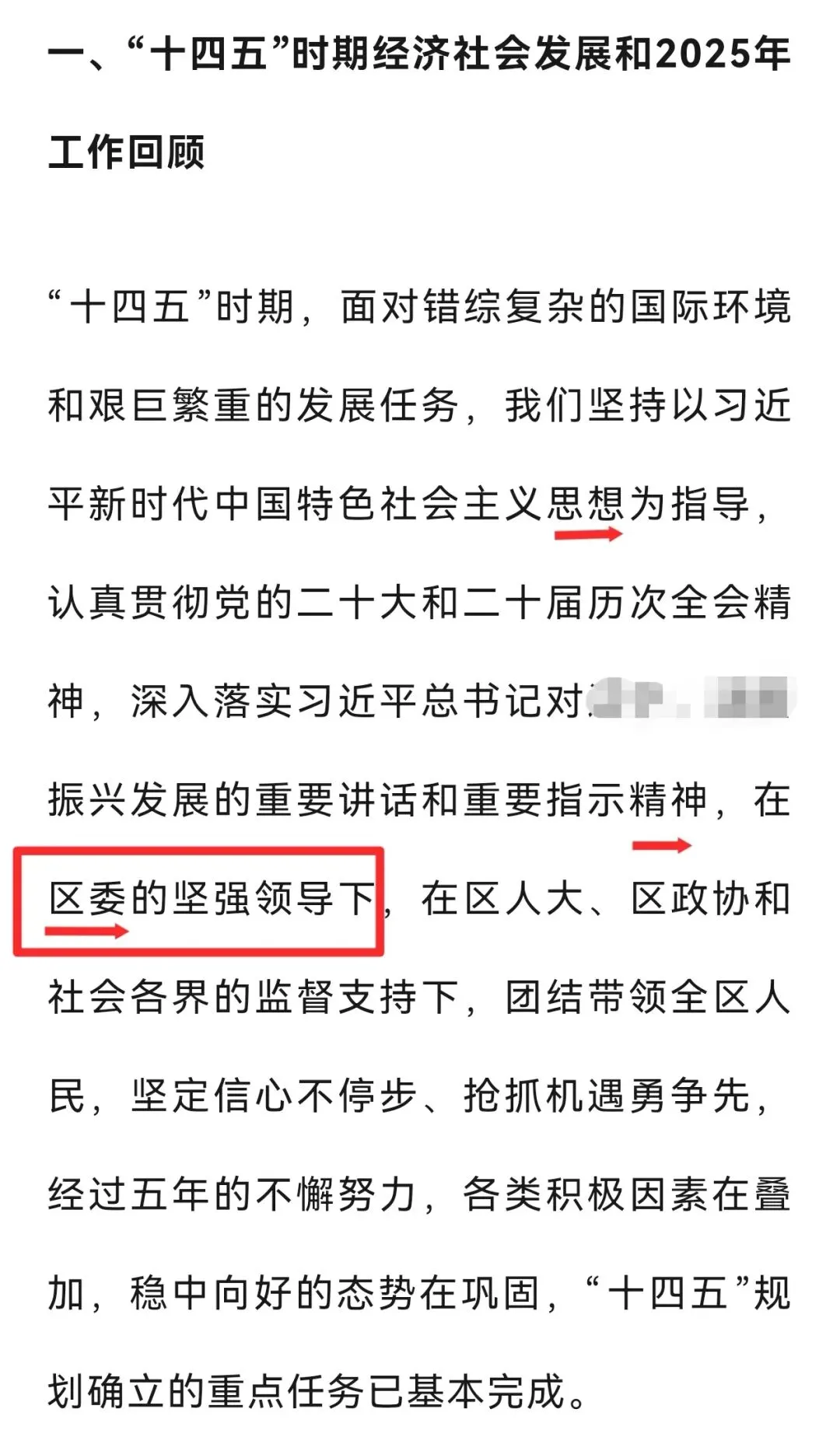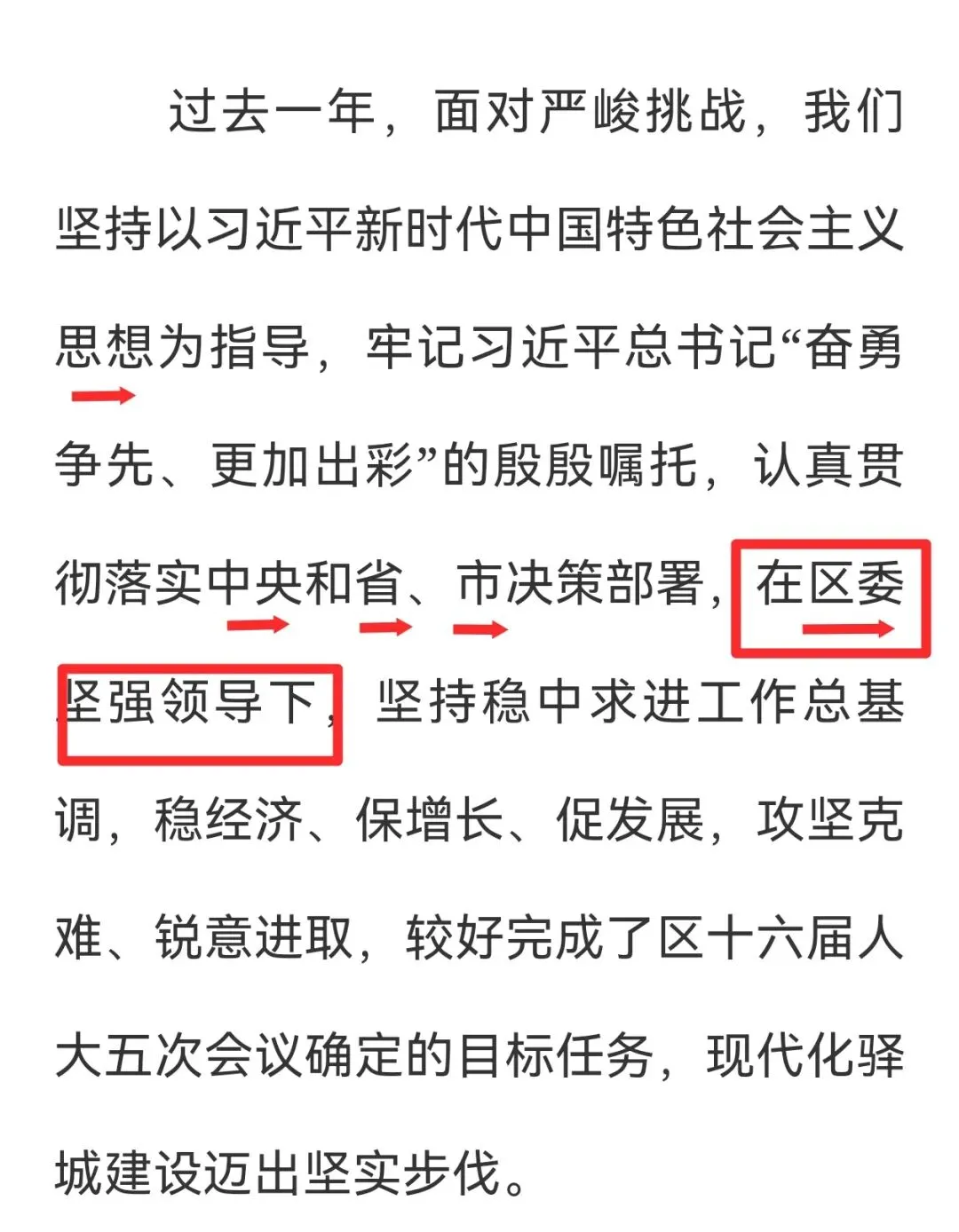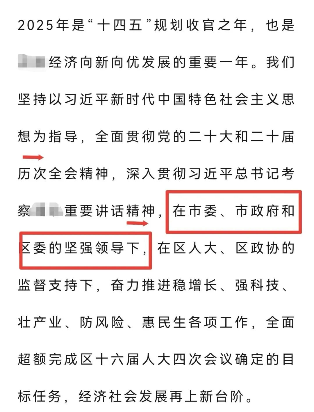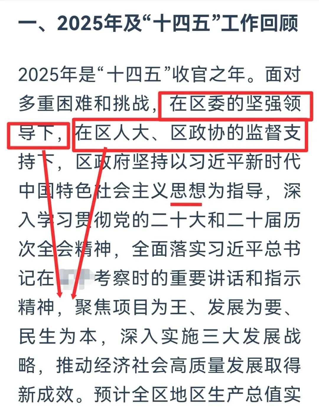 各地进入“两会”时间,政府工作报告成为大家热议的话题。今天说说政府工作报告开篇布局里隐藏的行文规律。以下图为例:2025年是“十四五”规划收官之年,也是XX经济向新向优发展的重要一年。(时代定位)我们坚持以习近平新时代中国特色社会主义思想为指导,全面贯彻党的二十大和二十届历次全会精神,深入贯彻习近平总书记考察XX重要讲话精神(指导思想),在市委、市政府和区委的坚强领导下,在区人大、区政协的监督支持下(领导与监督体系),奋力推进稳增长、强科技、壮产业、防风险、惠民生各项工作,全面超额完成区十六届人大四次会议确定的目标任务,经济社会发展再上新台阶(工作及成效)。通过解析不难发现,开篇整段呈现出“总体定位+思想引领+领导支撑+工作成效”的四层式结构。需要注意的是指导思想和领导与监督体系的位置,✅ 正确位置:思想理论指导 → 领导主体(市委市政府+区委)→ 监督支持(人大政协)→ 具体工作。为什么一定要把直接领导与监督体系放在指导思想之后呢?首先,思想是行动的先导。开篇“我们坚持以习近平新时代中国特色社会主义思想为指导”,这是政治灵魂和理论基础,决定了工作的方向。其次,直接领导与监督体系是保障。“市委市政府和区委的坚强领导”是确保思想落地、方向不偏的政治保障和组织保障。遵循的逻辑链条是,只有先明确“听谁的话(思想)”,才能谈“谁来带着干(领导)”,最后才是“具体干什么(工作)”。将指导思想置于首位,随后,按照层级由高到低,依次排列中央、省、市各级相关内容。最后才是直接领导,即“在市委市政府和区委的坚强领导下” 。这样行文,逻辑清晰地展现出从宏观理论指引到具体层级领导的完整脉络,确保表述既全面又有序。指导思想在前,直接领导在后,是绝对规范的最优位置。也发现不少报告把直接领导放在前面,总让人觉得不太规范。