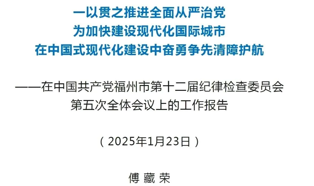 2025年是“十四五”规划收官之年,是扎实推进中国式现代化福州实践的关键一年。做好今年工作,要坚持以习近平新时代中国特色社会主义思想为指导,全面贯彻落实党的二十大和二十届二中、三中全会精神,深入学习贯彻习近平总书记关于党的建设的重要思想、关于党的自我革命的重要思想和在福建考察时的重要讲话精神,按照二十届中央纪委四次全会、省纪委十一届五次全会和市委十二届七次、八次全会部署,深刻领悟“两个确立”的决定性意义,增强“四个意识”、坚定“四个自信”、做到“两个维护”,坚持用改革精神和严的标准管党治党,推动落实全面从严治党政治责任,推动健全全面从严治党体系,纵深推进正风肃纪反腐,以实事求是的精神和极端负责的作风,持续推进全市纪检监察工作高质量发展,为福州加快建设现代化国际城市,在中国式现代化建设中奋勇争先清障护航。