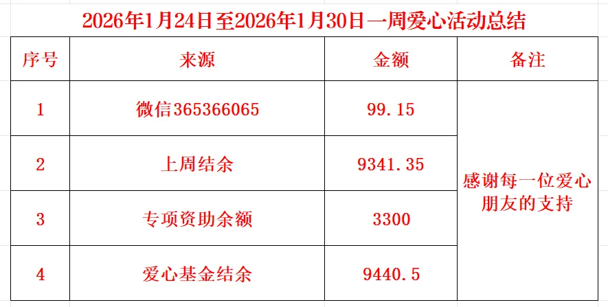 这一周,我们汇聚爱心90多元,谢谢我的初中同学罗仁政的爱心。这一周汇聚情况如下: