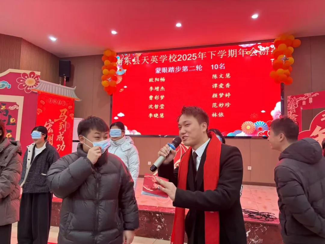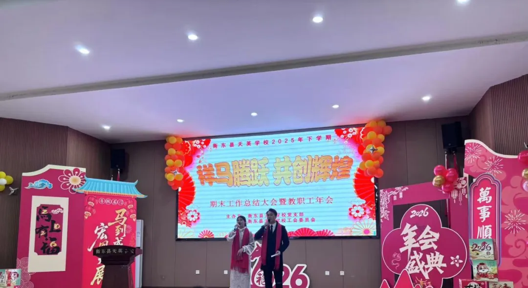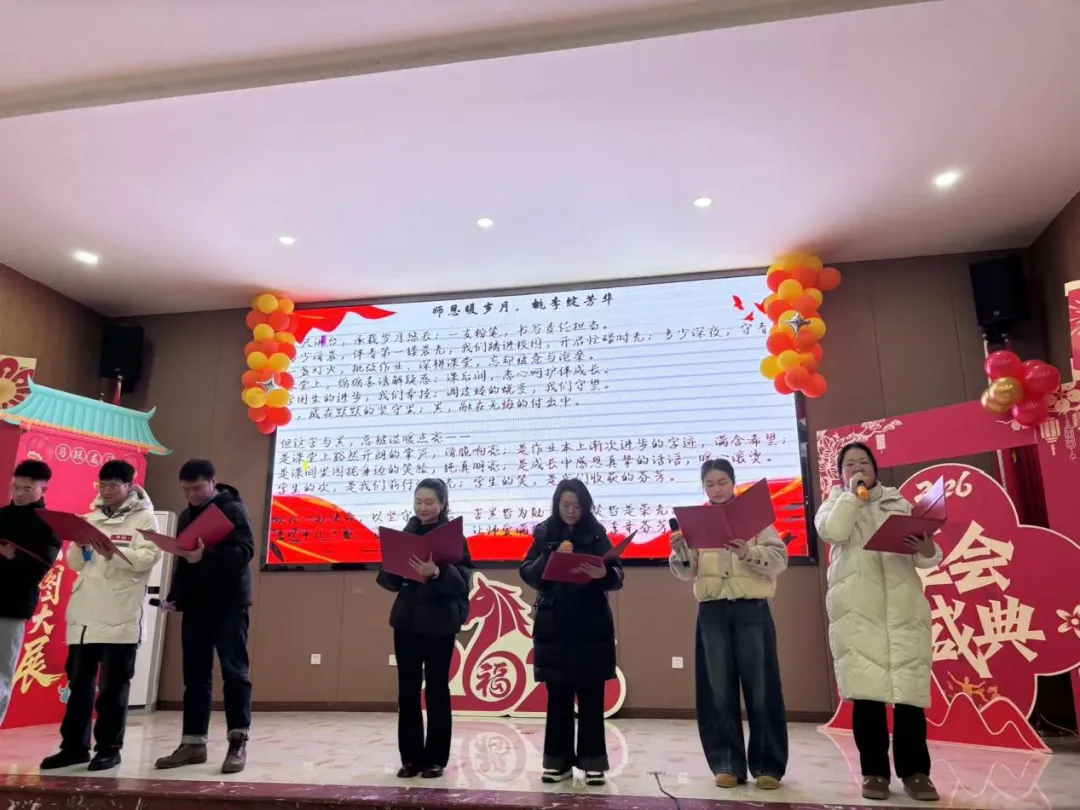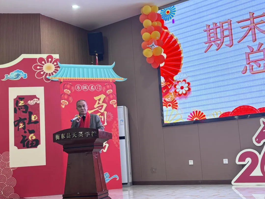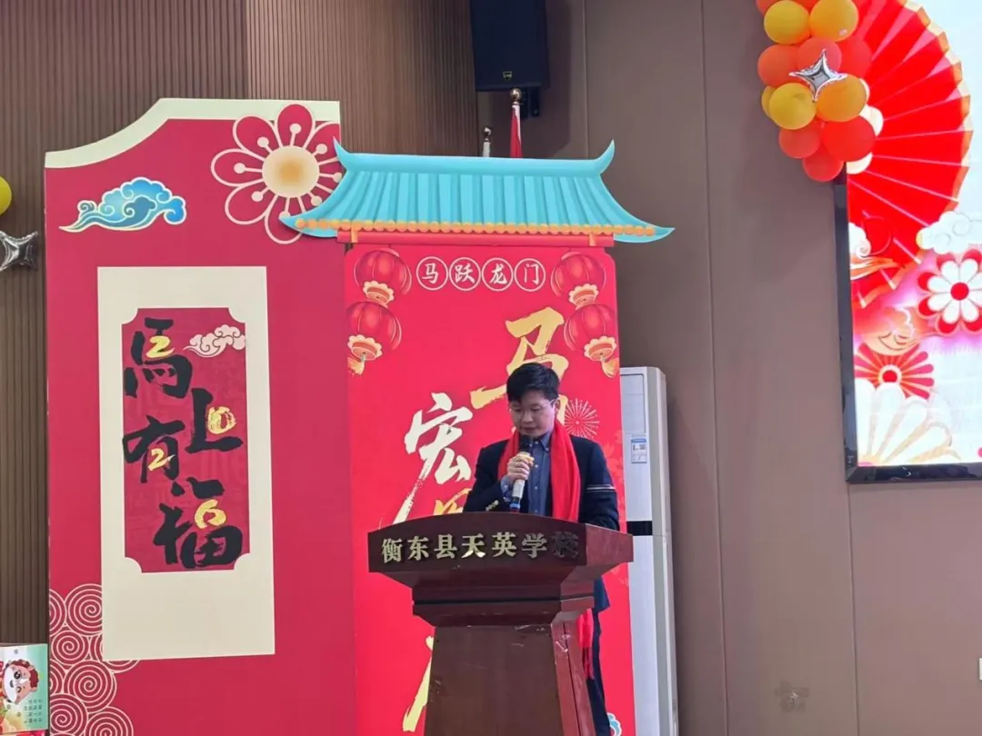 年会在主持人热情洋溢的开场白中拉开序幕,温馨的问候、诚挚的祝福瞬间点燃全场氛围。首先,执行董事彭麒悟先生进行大会致辞。彭董与大家一起回顾了2025年学校各项工作取得的丰硕成果——教学质量稳步提升、德育建设亮点纷呈、师生竞赛捷报频传,他肯定了每一项成绩的背后,都离不开老师们的辛勤耕耘与无私奉献。同时,彭董立足学校发展全局,高屋建瓴地指明了下学期的工作方向,从课程改革深化到师资队伍建设,从校园文化升级到育人质量提升,为全体天英人明确了奋斗目标,凝聚了前行力量。