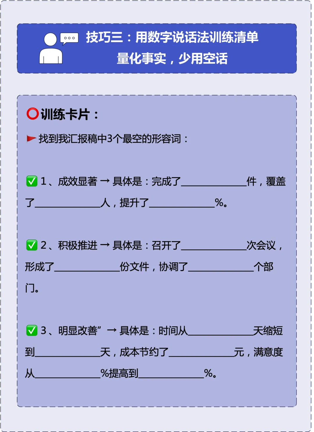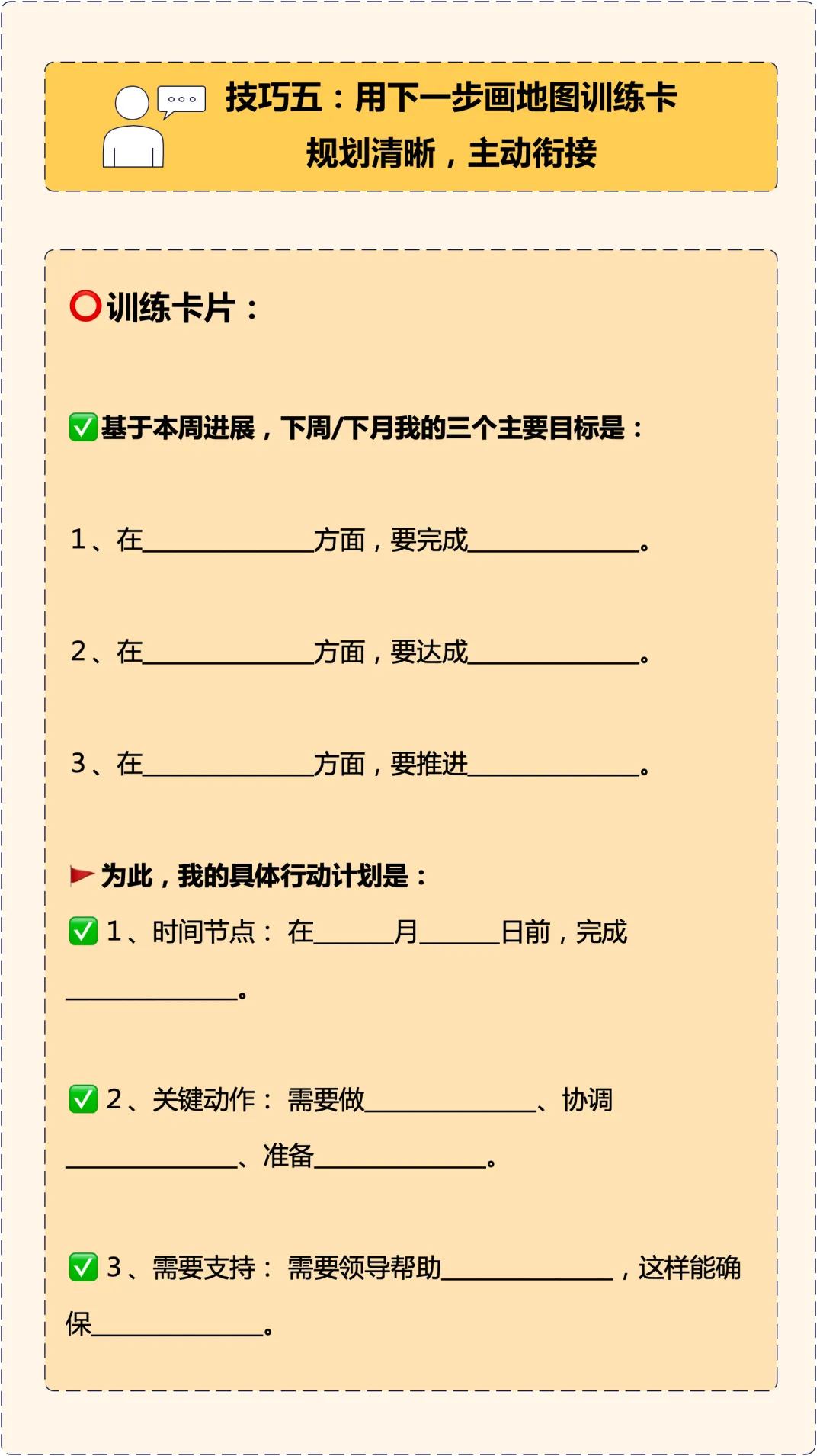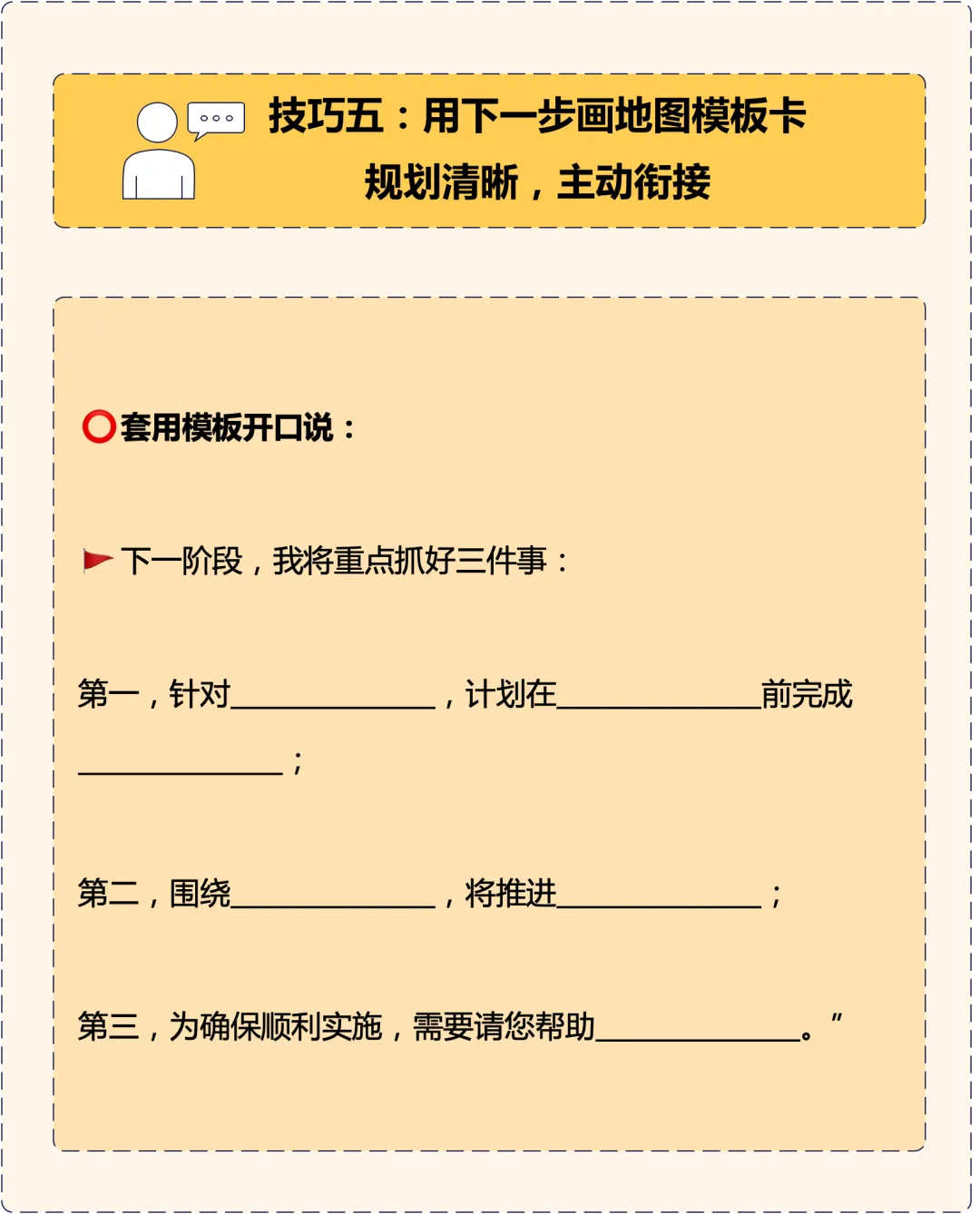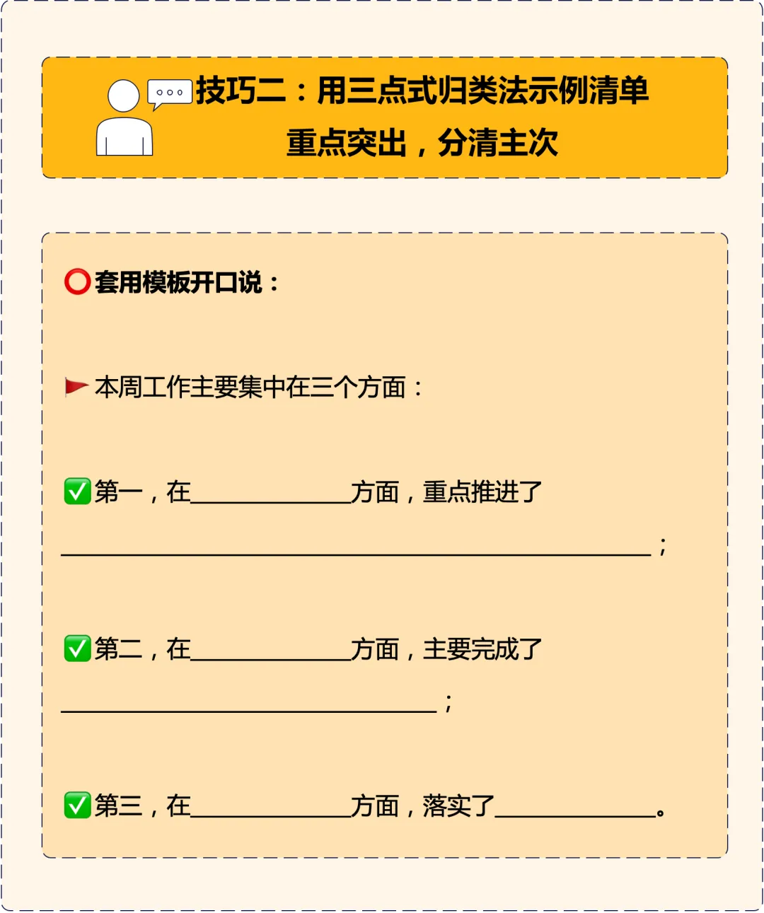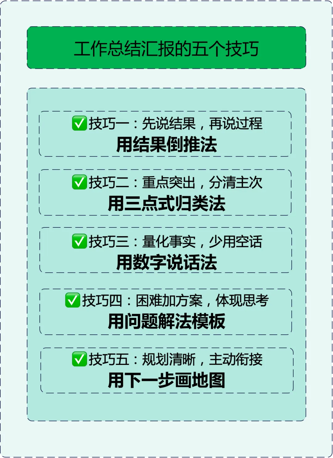 ✅第二个技巧:用三点式归类法,重点突出,分清主次,搭建汇报的逻辑骨架。我手头的工作一大堆,团建,业务,安全,维稳,……,那个都感觉都很重要,汇报时我就按照周一到周五,流水账式的汇报给领导,可这样每次领导都不满意,感觉没有重点,而且还记不住,我要怎么办?可以运用三点式归类法,这个技巧,就是能帮助你把流水账式的汇报,变成结构化的汇报。就是需要你把琐碎的工作,打包成三个有逻辑的包裹,就好像把满桌面的文件,分类好,放在三个不同的文件夹中📂中一样,进行分类,归纳。这样领导也很好拿,很好记。第一步,就是把你所做的事情,都从1到5,罗列出来,这个时候,不管自己做了什么,都通通罗列出来,没有关系,只有全部拿出来,这样才能进行第二步的分类。用三个不同的文件夹一样,这个是比喻,就是分类,突出重点,主次分明了。前面第一步,罗列,第二步,是分类,第三步,就是线性表达。如果某件事不能归类到你的三个文件夹中,要么它不重要,要么你的归纳逻辑需要调整,把真正的重点,永远只能装进三个文件夹中。✅第三个技巧:用数字说话法,量化事实,少用空话,让成绩实实在在的被看见。为什么我说这周干的不错,成效显著,这样的形容词之类的,领导总是看起来无动于衷呢?为什么?我要怎么证明我的工作真的做扎实了,而且还是有效的,而不是自我感觉良好的状态呢?这里就可以用第三个技巧,用数字说话法,把模糊的一些概念,一些描述,都变成清晰的,可以描述的,可以衡量的,可以对比的数据。因为在汇报工作总结的时候,不能量化的成绩,等于没有成绩。你想呀,如果医生跟你说,你最近恢复得不错。你是不是心里也打鼓,感觉不到恢复的怎么样。但是医生跟你说,你最近的白细胞计数从一万降到了七千,正常了,你是不是瞬间感觉到不一样,你自己也会立刻心安一些。工作汇报也是同样的道理。数字自带权威,自带说服力。来一张训练清单,这张清单,就是整理思路,有具体的步骤,能容易上手,找到第一步的抓手。这张就是模版清单,就是你组织好语言,直接用这张模板,套用就可以表达出来。即学即用,数字说话法,平时需要养成这样数据思维,就是自己要训练下,对数字敏感一些,遇到一个数字,自己多留意下,看看同事其他领导的汇报,数字说话真的会不一样。工作的台账记得细致一点,汇报的时候,就能把这些数字调用出来,比如,和过去对比,和目标对比,和同类单位对比,一个关键的数字,胜过千言万语。✅第四个技巧:用问题解法模板,困难加方案,体现出你的深度思考,也能展示出你的担当。在工作总结汇报的时候,总是报喜不报忧,遇到一些难题,我该不该报?报了怕领导觉得我能力不行,不报又怕以后出了什么大事,自己没有把这种风险,提前让领导知道。具体怎么汇报这些困难,才能让领导觉得我不是在甩锅,而是有风险意识,而是在主动的担当事情。这就是需要问题解决法模版来进行汇报,带着问题见领导,这是工作上的本能反应,你要是带着方案去见领导,这就是本事。因为你在汇报问题的时候,你也能呈现出你的深度思考和建议,你是来帮助领导做选择题的,不是来让领导做问答题的。我们来一张训练清单卡,帮助你梳理下思路,组织好语言。在汇报工作的时候,永远不要问领导怎么办,而是要问,这两个方案哪个更好一些。这细微的差别,决定了领导是把你看成了问题分子,还是解决问题的高手了。✅第五个技巧:用下一步画地图法,规划清晰,主动衔接来赢得领导的支持。汇报完过去的工作,领导问,下一步,你准备怎么办呢?我不只能泛泛的说一句,我继续努力,怎么样才能让领导不仅对我的过去满意,还能对我的未来也放心,愿意给我更多资源和支持呢?比如领导总是会追问,然后呢?具体什么时候能完成?需要谁配合?我常常被问住了。下一步画地图,就是把未来的一周计划,或者一个月的计划,变成一张有路径,有节点,有资源配置的行动地图。你要让领导看到,工作在你的掌握中,正在朝着预定好的目标推进。再来一张模板卡,你把组织好的语言,用线性表达出来。领导把你放在这个位置上,就希望你能像一位船长一样,不仅能报告船现在的位置,还能清晰到知道,下一站要去哪里,怎么去,需要多少补给。还有就是,你的下一周,或者下一步的计划,必须要与本周汇报的成果和问题相呼应,形成闭环,工作体现出可持续。主动请求支持时,要具体,要合理,并说明这个支持能带来什么具体的回报。这样让领导觉得他的支持是值得的,而且是非常有效的。刻意训练这五个小技巧,就是帮助你工作总结,从开场抓住注意力,到中间建立内容的逻辑关系,摆事实,显示出你的担当,再到最后结尾,引领未来,刚刚好,形成一个完整的,有说服力的汇报闭环。这些技巧,从阅读到实操,需要有一个训练和运用的过程,下次你总结的时候,五个技巧估计全部记不住,你只要哪怕记住了一个,先把一个用起来,就会得到正反馈,用好了一个,第二个就能顺手运用起来。工作干得好是很重要的一个环节,但是能让领导清晰地看见你,干得好,同样重要。来二张图,让你秒懂,好吸收: