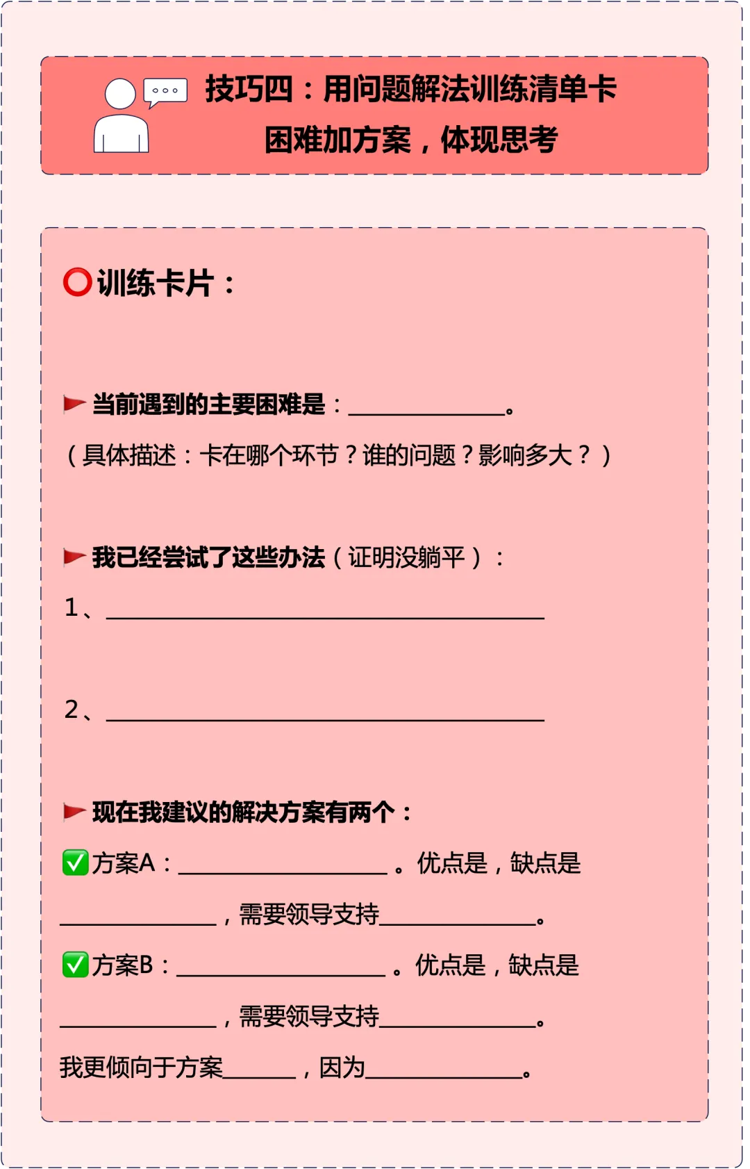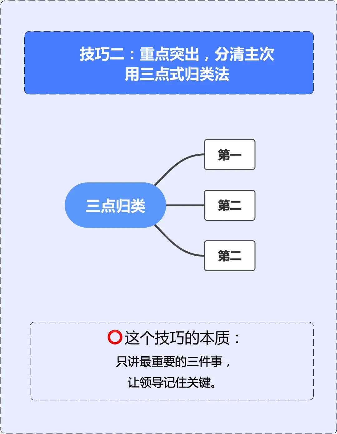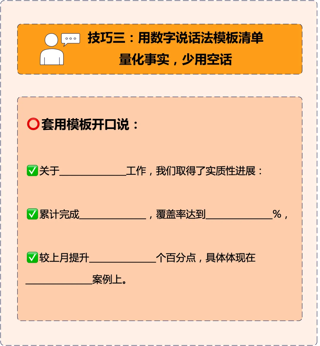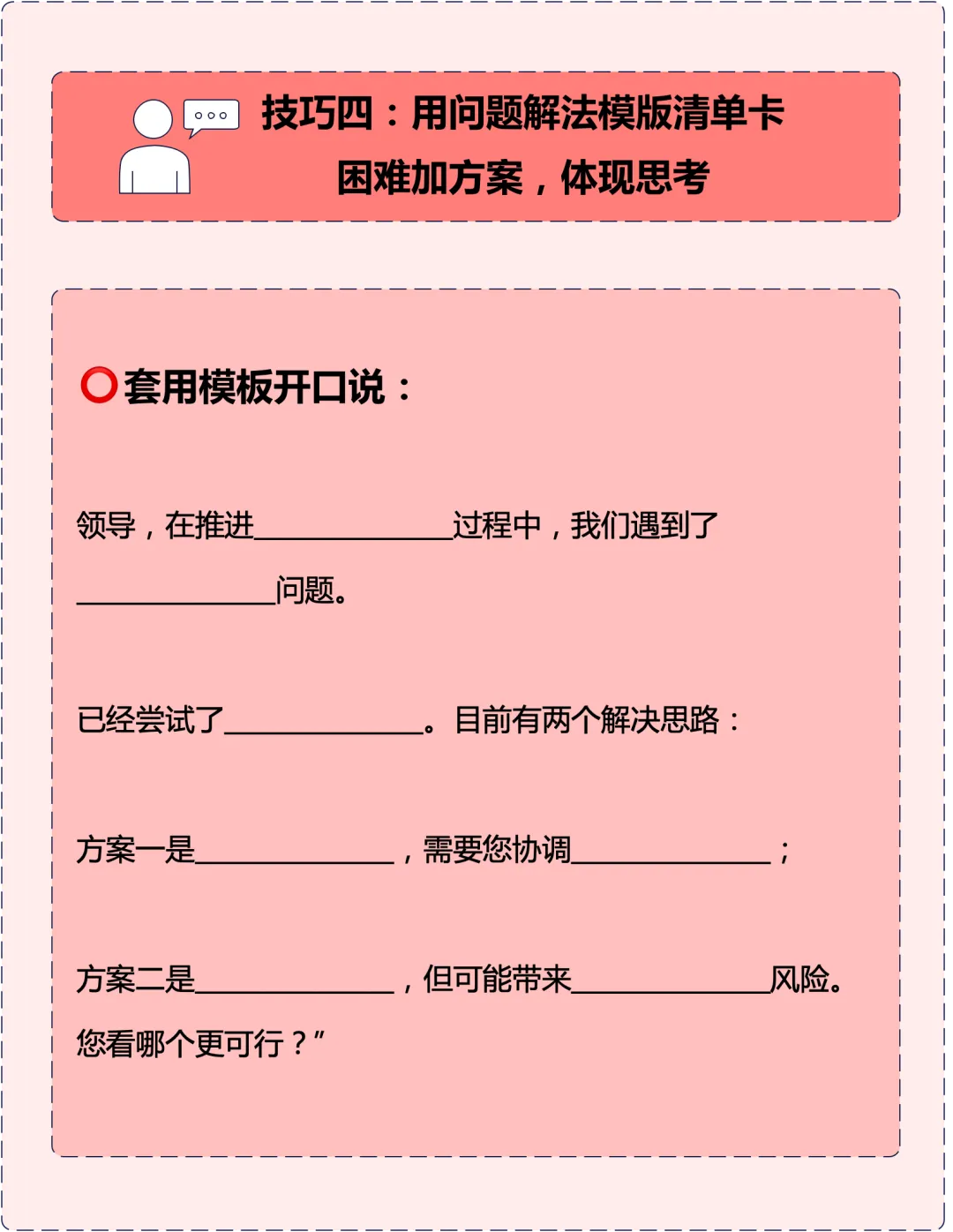 ✅第二个技巧:用三点式归类法,重点突出,分清主次,搭建汇报的逻辑骨架。我手头的工作一大堆,团建,业务,安全,维稳,……,那个都感觉都很重要,汇报时我就按照周一到周五,流水账式的汇报给领导,可这样每次领导都不满意,感觉没有重点,而且还记不住,我要怎么办?可以运用三点式归类法,这个技巧,就是能帮助你把流水账式的汇报,变成结构化的汇报。就是需要你把琐碎的工作,打包成三个有逻辑的包裹,就好像把满桌面的文件,分类好,放在三个不同的文件夹中📂中一样,进行分类,归纳。这样领导也很好拿,很好记。第一步,就是把你所做的事情,都从1到5,罗列出来,这个时候,不管自己做了什么,都通通罗列出来,没有关系,只有全部拿出来,这样才能进行第二步的分类。用三个不同的文件夹一样,这个是比喻,就是分类,突出重点,主次分明了。前面第一步,罗列,第二步,是分类,第三步,就是线性表达。如果某件事不能归类到你的三个文件夹中,要么它不重要,要么你的归纳逻辑需要调整,把真正的重点,永远只能装进三个文件夹中。✅第三个技巧:用数字说话法,量化事实,少用空话,让成绩实实在在的被看见。为什么我说这周干的不错,成效显著,这样的形容词之类的,领导总是看起来无动于衷呢?为什么?我要怎么证明我的工作真的做扎实了,而且还是有效的,而不是自我感觉良好的状态呢?这里就可以用第三个技巧,用数字说话法,把模糊的一些概念,一些描述,都变成清晰的,可以描述的,可以衡量的,可以对比的数据。因为在汇报工作总结的时候,不能量化的成绩,等于没有成绩。你想呀,如果医生跟你说,你最近恢复得不错。你是不是心里也打鼓,感觉不到恢复的怎么样。但是医生跟你说,你最近的白细胞计数从一万降到了七千,正常了,你是不是瞬间感觉到不一样,你自己也会立刻心安一些。工作汇报也是同样的道理。数字自带权威,自带说服力。来一张训练清单,这张清单,就是整理思路,有具体的步骤,能容易上手,找到第一步的抓手。这张就是模版清单,就是你组织好语言,直接用这张模板,套用就可以表达出来。即学即用,数字说话法,平时需要养成这样数据思维,就是自己要训练下,对数字敏感一些,遇到一个数字,自己多留意下,看看同事其他领导的汇报,数字说话真的会不一样。工作的台账记得细致一点,汇报的时候,就能把这些数字调用出来,比如,和过去对比,和目标对比,和同类单位对比,一个关键的数字,胜过千言万语。✅第四个技巧:用问题解法模板,困难加方案,体现出你的深度思考,也能展示出你的担当。在工作总结汇报的时候,总是报喜不报忧,遇到一些难题,我该不该报?报了怕领导觉得我能力不行,不报又怕以后出了什么大事,自己没有把这种风险,提前让领导知道。具体怎么汇报这些困难,才能让领导觉得我不是在甩锅,而是有风险意识,而是在主动的担当事情。这就是需要问题解决法模版来进行汇报,带着问题见领导,这是工作上的本能反应,你要是带着方案去见领导,这就是本事。因为你在汇报问题的时候,你也能呈现出你的深度思考和建议,你是来帮助领导做选择题的,不是来让领导做问答题的。我们来一张训练清单卡,帮助你梳理下思路,组织好语言。在汇报工作的时候,永远不要问领导怎么办,而是要问,这两个方案哪个更好一些。这细微的差别,决定了领导是把你看成了问题分子,还是解决问题的高手了。✅第五个技巧:用下一步画地图法,规划清晰,主动衔接来赢得领导的支持。汇报完过去的工作,领导问,下一步,你准备怎么办呢?我不只能泛泛的说一句,我继续努力,怎么样才能让领导不仅对我的过去满意,还能对我的未来也放心,愿意给我更多资源和支持呢?比如领导总是会追问,然后呢?具体什么时候能完成?需要谁配合?我常常被问住了。下一步画地图,就是把未来的一周计划,或者一个月的计划,变成一张有路径,有节点,有资源配置的行动地图。你要让领导看到,工作在你的掌握中,正在朝着预定好的目标推进。再来一张模板卡,你把组织好的语言,用线性表达出来。领导把你放在这个位置上,就希望你能像一位船长一样,不仅能报告船现在的位置,还能清晰到知道,下一站要去哪里,怎么去,需要多少补给。还有就是,你的下一周,或者下一步的计划,必须要与本周汇报的成果和问题相呼应,形成闭环,工作体现出可持续。主动请求支持时,要具体,要合理,并说明这个支持能带来什么具体的回报。这样让领导觉得他的支持是值得的,而且是非常有效的。刻意训练这五个小技巧,就是帮助你工作总结,从开场抓住注意力,到中间建立内容的逻辑关系,摆事实,显示出你的担当,再到最后结尾,引领未来,刚刚好,形成一个完整的,有说服力的汇报闭环。这些技巧,从阅读到实操,需要有一个训练和运用的过程,下次你总结的时候,五个技巧估计全部记不住,你只要哪怕记住了一个,先把一个用起来,就会得到正反馈,用好了一个,第二个就能顺手运用起来。工作干得好是很重要的一个环节,但是能让领导清晰地看见你,干得好,同样重要。来二张图,让你秒懂,好吸收: