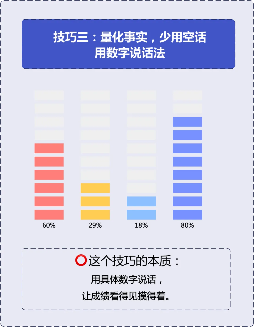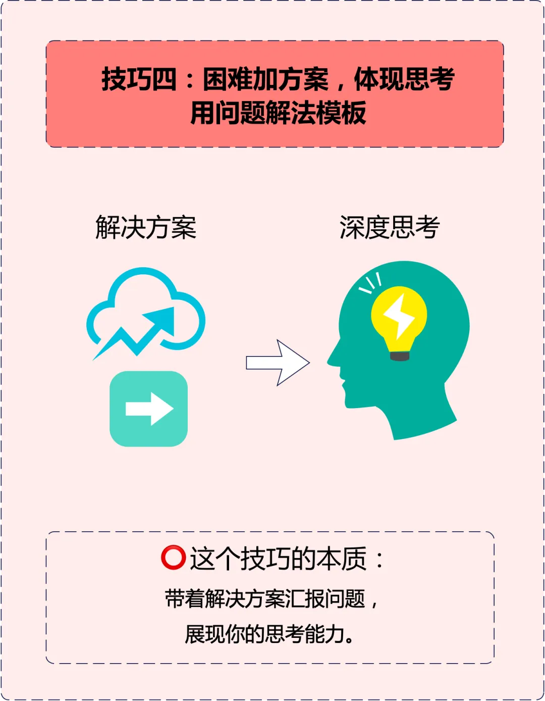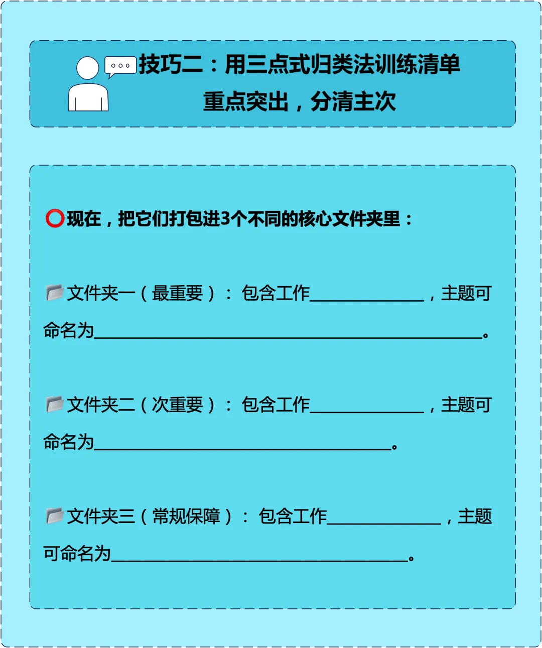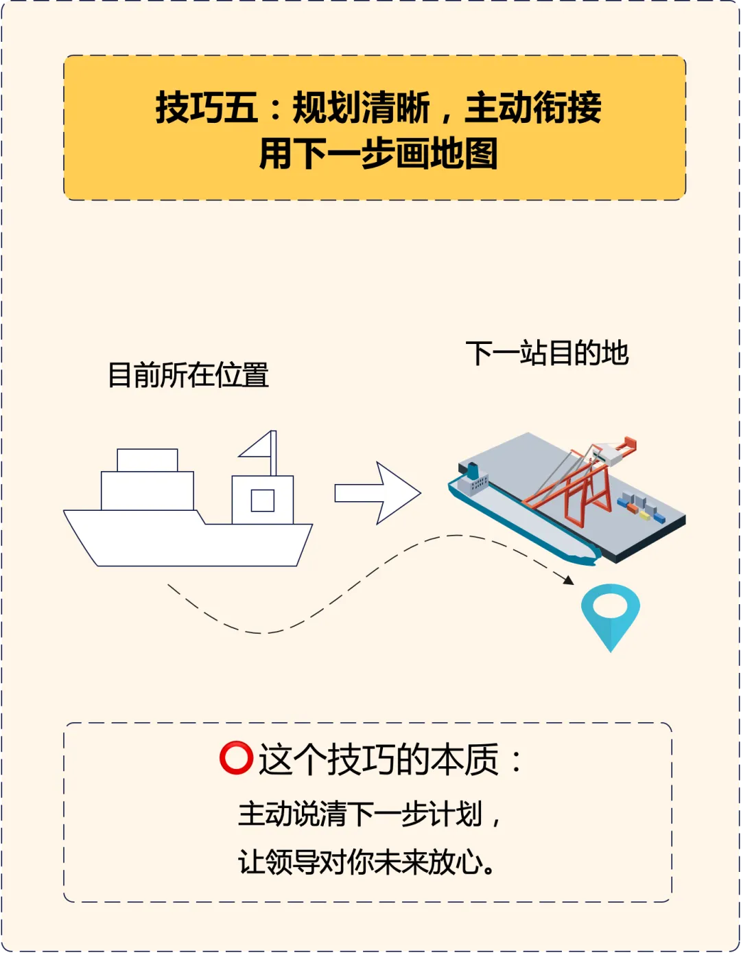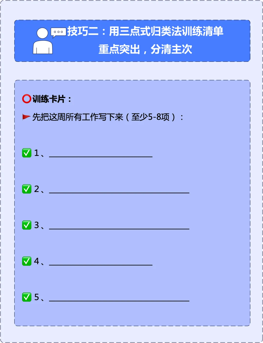 ✅第二个技巧:用三点式归类法,重点突出,分清主次,搭建汇报的逻辑骨架。我手头的工作一大堆,团建,业务,安全,维稳,……,那个都感觉都很重要,汇报时我就按照周一到周五,流水账式的汇报给领导,可这样每次领导都不满意,感觉没有重点,而且还记不住,我要怎么办?可以运用三点式归类法,这个技巧,就是能帮助你把流水账式的汇报,变成结构化的汇报。就是需要你把琐碎的工作,打包成三个有逻辑的包裹,就好像把满桌面的文件,分类好,放在三个不同的文件夹中📂中一样,进行分类,归纳。这样领导也很好拿,很好记。第一步,就是把你所做的事情,都从1到5,罗列出来,这个时候,不管自己做了什么,都通通罗列出来,没有关系,只有全部拿出来,这样才能进行第二步的分类。用三个不同的文件夹一样,这个是比喻,就是分类,突出重点,主次分明了。前面第一步,罗列,第二步,是分类,第三步,就是线性表达。如果某件事不能归类到你的三个文件夹中,要么它不重要,要么你的归纳逻辑需要调整,把真正的重点,永远只能装进三个文件夹中。✅第三个技巧:用数字说话法,量化事实,少用空话,让成绩实实在在的被看见。为什么我说这周干的不错,成效显著,这样的形容词之类的,领导总是看起来无动于衷呢?为什么?我要怎么证明我的工作真的做扎实了,而且还是有效的,而不是自我感觉良好的状态呢?这里就可以用第三个技巧,用数字说话法,把模糊的一些概念,一些描述,都变成清晰的,可以描述的,可以衡量的,可以对比的数据。因为在汇报工作总结的时候,不能量化的成绩,等于没有成绩。你想呀,如果医生跟你说,你最近恢复得不错。你是不是心里也打鼓,感觉不到恢复的怎么样。但是医生跟你说,你最近的白细胞计数从一万降到了七千,正常了,你是不是瞬间感觉到不一样,你自己也会立刻心安一些。工作汇报也是同样的道理。数字自带权威,自带说服力。来一张训练清单,这张清单,就是整理思路,有具体的步骤,能容易上手,找到第一步的抓手。这张就是模版清单,就是你组织好语言,直接用这张模板,套用就可以表达出来。即学即用,数字说话法,平时需要养成这样数据思维,就是自己要训练下,对数字敏感一些,遇到一个数字,自己多留意下,看看同事其他领导的汇报,数字说话真的会不一样。工作的台账记得细致一点,汇报的时候,就能把这些数字调用出来,比如,和过去对比,和目标对比,和同类单位对比,一个关键的数字,胜过千言万语。✅第四个技巧:用问题解法模板,困难加方案,体现出你的深度思考,也能展示出你的担当。在工作总结汇报的时候,总是报喜不报忧,遇到一些难题,我该不该报?报了怕领导觉得我能力不行,不报又怕以后出了什么大事,自己没有把这种风险,提前让领导知道。具体怎么汇报这些困难,才能让领导觉得我不是在甩锅,而是有风险意识,而是在主动的担当事情。这就是需要问题解决法模版来进行汇报,带着问题见领导,这是工作上的本能反应,你要是带着方案去见领导,这就是本事。因为你在汇报问题的时候,你也能呈现出你的深度思考和建议,你是来帮助领导做选择题的,不是来让领导做问答题的。我们来一张训练清单卡,帮助你梳理下思路,组织好语言。在汇报工作的时候,永远不要问领导怎么办,而是要问,这两个方案哪个更好一些。这细微的差别,决定了领导是把你看成了问题分子,还是解决问题的高手了。✅第五个技巧:用下一步画地图法,规划清晰,主动衔接来赢得领导的支持。汇报完过去的工作,领导问,下一步,你准备怎么办呢?我不只能泛泛的说一句,我继续努力,怎么样才能让领导不仅对我的过去满意,还能对我的未来也放心,愿意给我更多资源和支持呢?比如领导总是会追问,然后呢?具体什么时候能完成?需要谁配合?我常常被问住了。下一步画地图,就是把未来的一周计划,或者一个月的计划,变成一张有路径,有节点,有资源配置的行动地图。你要让领导看到,工作在你的掌握中,正在朝着预定好的目标推进。再来一张模板卡,你把组织好的语言,用线性表达出来。领导把你放在这个位置上,就希望你能像一位船长一样,不仅能报告船现在的位置,还能清晰到知道,下一站要去哪里,怎么去,需要多少补给。还有就是,你的下一周,或者下一步的计划,必须要与本周汇报的成果和问题相呼应,形成闭环,工作体现出可持续。主动请求支持时,要具体,要合理,并说明这个支持能带来什么具体的回报。这样让领导觉得他的支持是值得的,而且是非常有效的。刻意训练这五个小技巧,就是帮助你工作总结,从开场抓住注意力,到中间建立内容的逻辑关系,摆事实,显示出你的担当,再到最后结尾,引领未来,刚刚好,形成一个完整的,有说服力的汇报闭环。这些技巧,从阅读到实操,需要有一个训练和运用的过程,下次你总结的时候,五个技巧估计全部记不住,你只要哪怕记住了一个,先把一个用起来,就会得到正反馈,用好了一个,第二个就能顺手运用起来。工作干得好是很重要的一个环节,但是能让领导清晰地看见你,干得好,同样重要。来二张图,让你秒懂,好吸收: