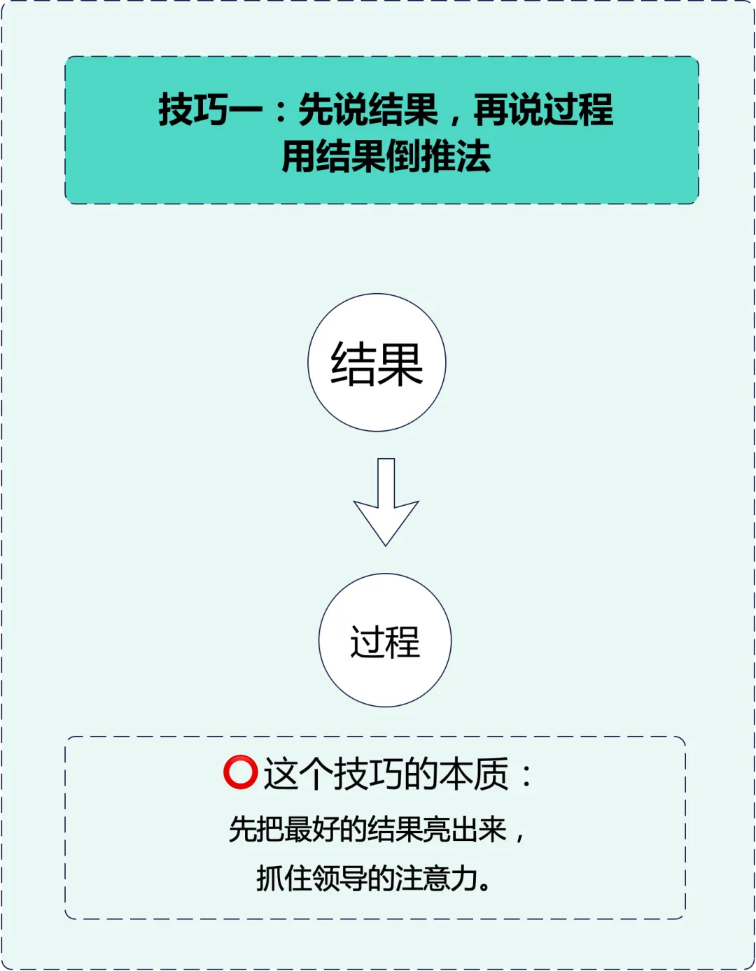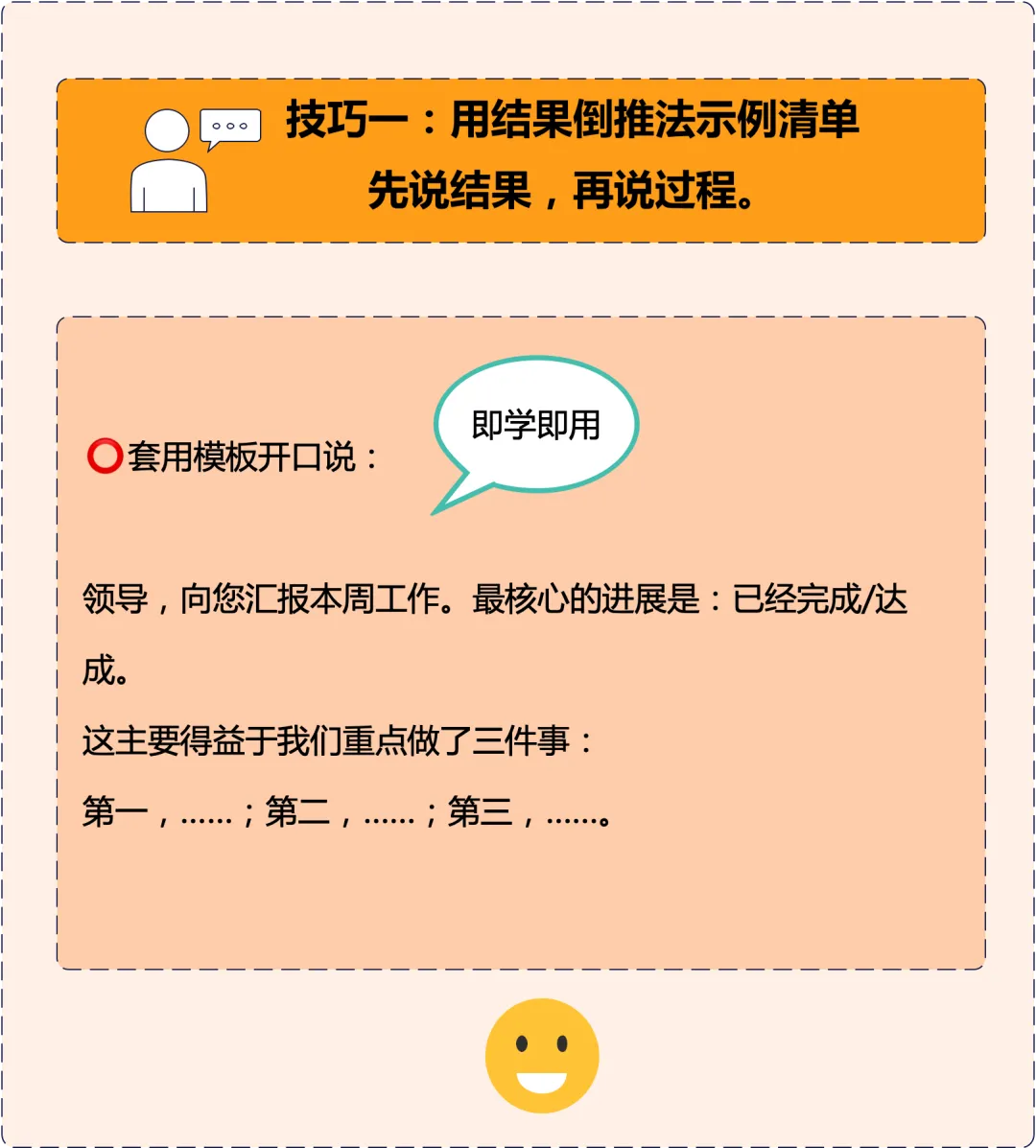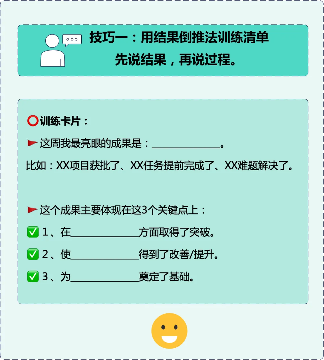 ✅第一个技巧:用结果倒推法,先说结果,再说过程,来抓住领导的注意力。我上来就事无巨细地,讲我做了哪些具体工作,可到了领导这里,感觉都是流水账一样,领导注意力也不集中,每次汇报的时候,领导都打断我说,你先说结果,我要怎么办?领导不是记事本,他是你工作的验收官,他第一眼想看到的是成品,是结果,而不是流水线。这就是为什么,很多读者跟我说的,自己的汇报就只有流水账式的。假设你运用这个结果倒推法,先说结果,再讲过程,一些再细节的东西,等到领导问的时候,再说,也比流水账好。先来一张训练清单,先说结果,再说过程,可以按照这个思路,来进行填空,把自己的思路捋一捋。再来一张示例清单,你开始的时候,记不住,消化不了,哪怕你把这句话,背下来,也可以,因为对汇报工作来说,是一个高频刚需的技巧。汇报前,一定要强制自己,用一句话来说清楚,这周我到底干成了什么事?这句话,就是你开场的第一句话,如果这句话说不清楚,那么只能证明你这周的工作没有聚焦,都分散了。还有更多关于讲话的问题,