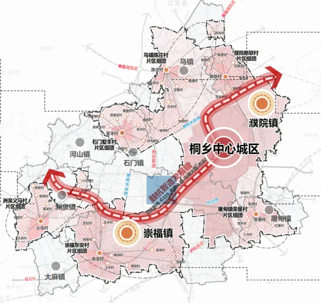 什么是“融杭智造”发展轴?根据《桐乡市“县城—中心镇—重点村”发展轴空间专项规划》(2025-2035年),“融杭智造”发展轴以沿崇新线-G320-崇福大道-乌镇大道-京杭大运河为依托,自西向东串联洲泉镇、崇福镇、中心城区、乌镇镇、濮院镇,面积472.78平方公里,将着力打造以“综合服务创新中心+产城融合工业重镇+科创时尚商贸强镇”为特色定位的县域城乡一体化发展重点区域,重点发展智能制造、文旅康养、现代农业,做好强城、兴村、融合三篇文章。