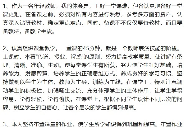 4、教学这一活动,没有反思的伴随就不会有进步。坚持每次授课后,认真回想,进行反思。记录其教法、做法以及操作不大理想的地方,及时做改进。