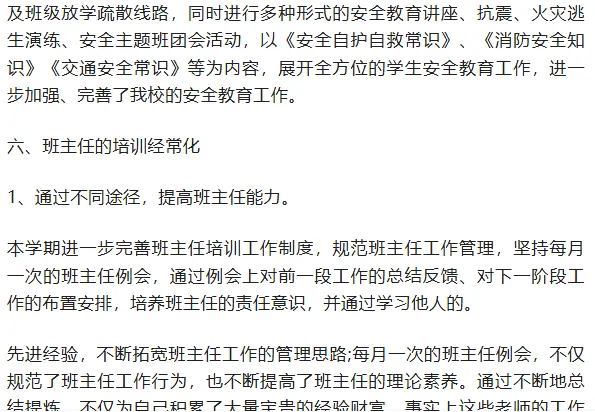 2、班主任通过自学和集体学习,提高了自身的德育水平,增强德育工作的针对性,在德育过程中注重投入更多的情感,更新德育观念,一切从学生的全面发展出发,注重工作方法的创新,工作中善于思考,肯动脑筋,不断改进班级管理或教育学生的新方法、新思路,使班级管理更具特色,德育工作更具实效性。