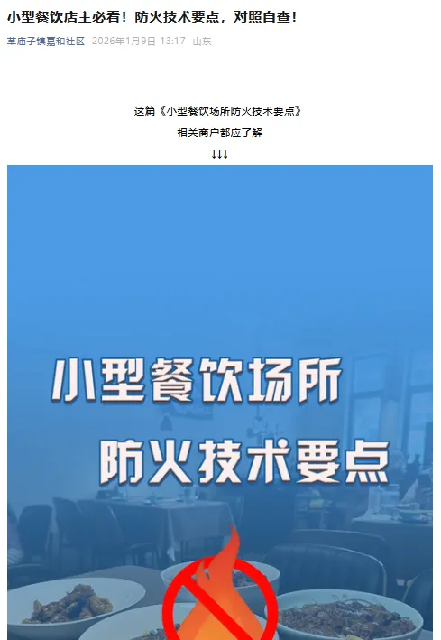 本月社区分享了小型餐饮场所防火技术要点,明确了该类场所的定义,涵盖疏散通道畅通、可燃装饰装修管控、厨房安全保障、消防设施设置强化、人员培训演练等核心要求,方便商户对照自查。