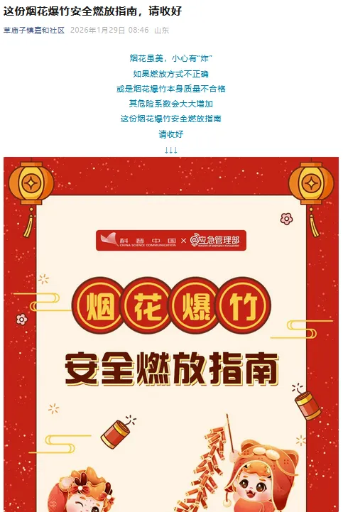 本月社区分享了烟花爆竹安全燃放指南,涵盖燃放地点选择、儿童燃放需成人陪护、存放注意事项、合格产品甄别方法,以及炸伤灼伤后的应急处理措施,提醒群众安全燃放。
