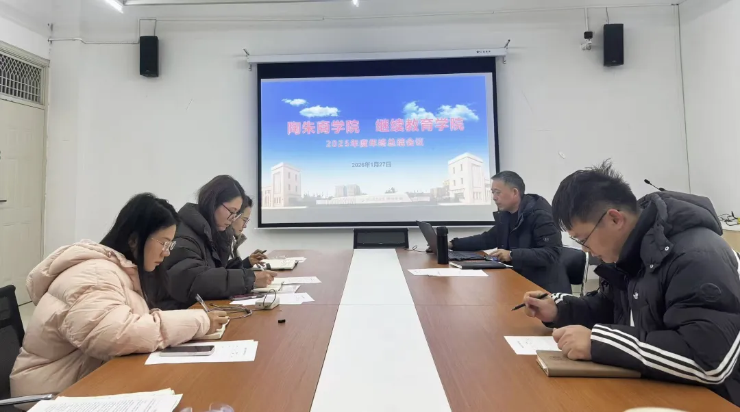 为总结2025年度工作成效,谋划2026年重点工作,1月27日,陶朱商学院、继续教育学院在人文5104会议室召开2025年度工作总结暨员工考核述职会议。会议由院长何尧军主持,学院全体员工参加会议。