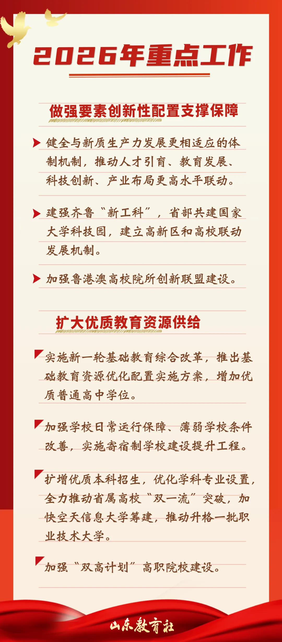 1月27日上午,山东省第十四届人民代表大会第四次会议开幕,省长周乃翔作政府工作报告。报告中回顾了2025年及“十四五”时期以来山东教育事业发展的主要成效,明确了2026年教育领域的重点工作方向。鲁教君梳理了其中教育相关内容,带您一同关注。