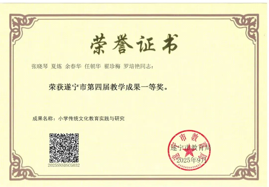 在“新时代·蜀少年”四川省青少年文化艺术展演(遂宁辖区)市级舞台,舞蹈《入莲间》、器乐《库劳小奏鸣曲》双获二等奖,合唱《彝族欢歌》获三等奖;船山区“弘扬中华文明 担当文化使命”演讲比赛中,张幼珊同学荣获一等奖。与此同时,学生数学思维运动会一举夺魁20人,省书法等级考试合格率95%,艺术、学科、人文三线并进,全面展现新时代少年昂扬自信、全面发展的精神风貌。