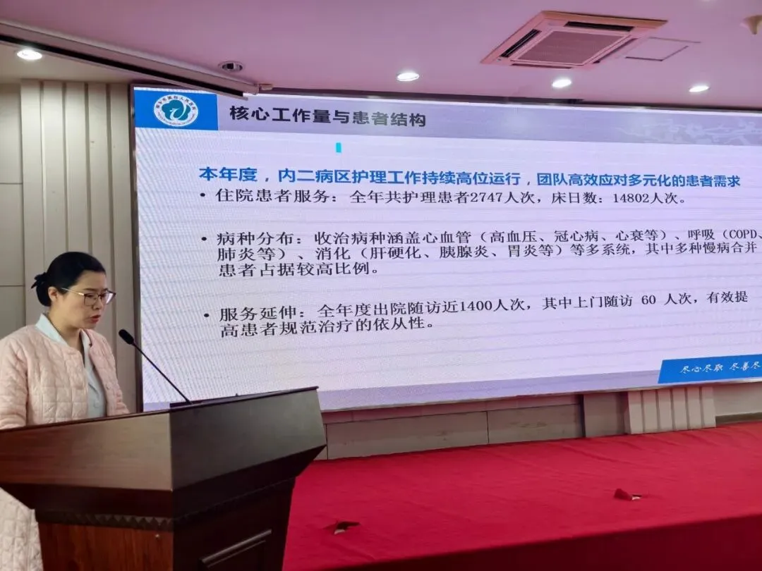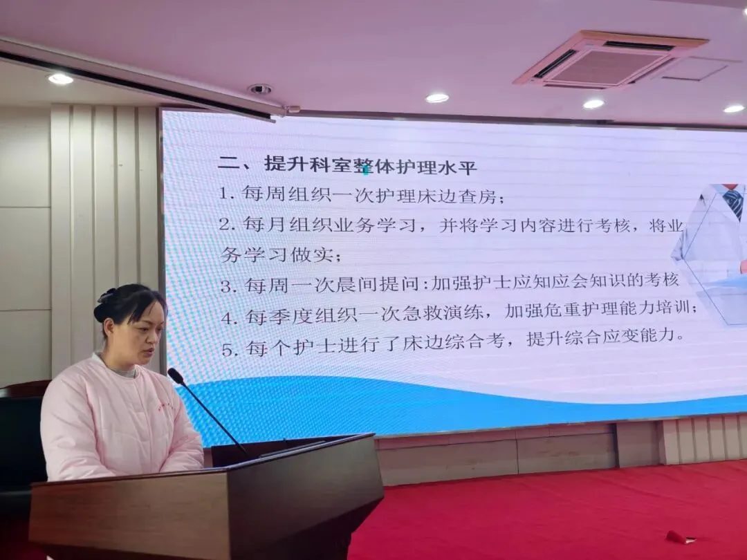 随后,各病区护士长依次登台,围绕护理质量安全、专科能力建设与服务模式创新等多维度展开汇报。内科护理团队针对老年患者“多病共存、功能衰退、心理脆弱”的特点,深化慢病管理内涵,优化护理流程;外科护理团队推行“围手术期精细化护理”,覆盖术前、术中、术后全链条,有效提升了手术患者满意度;急诊护理团队升级“快速响应急救体系”,强化多学科协作,大幅缩短急危重症抢救时间。此外,儿科、妇骨科、手术室、门诊、养护中心等护理团队也纷纷分享了各自在专科护理、人文关怀与流程优化方面的创新举措,充分体现了“以患者为中心”的服务理念。