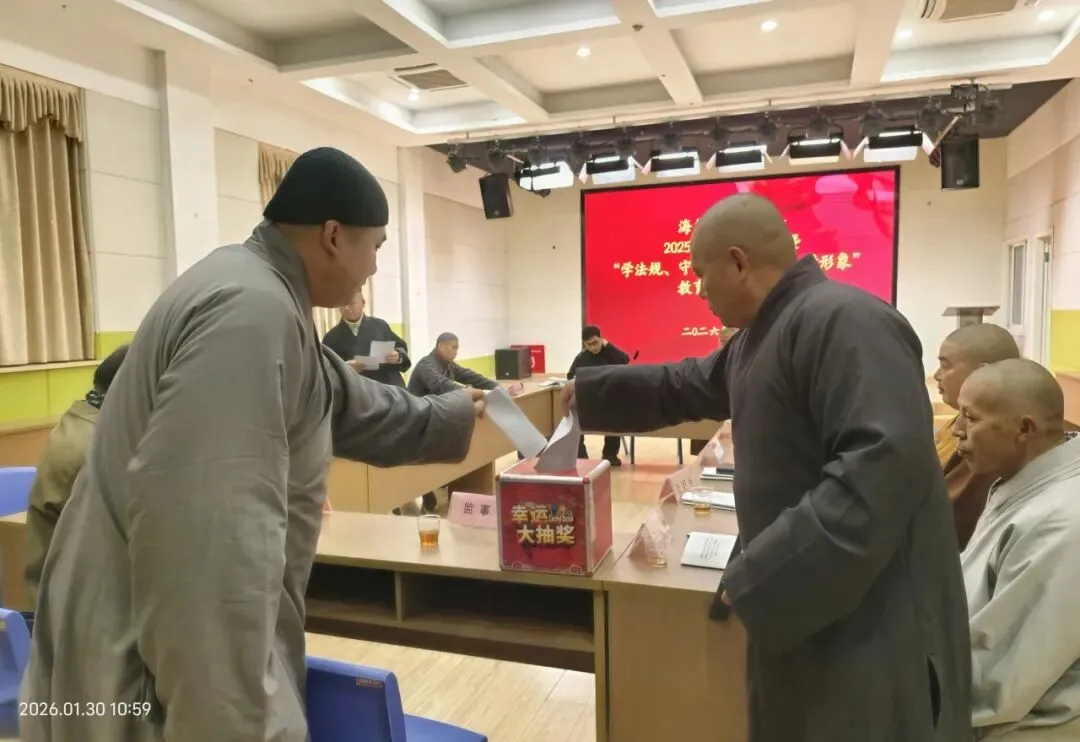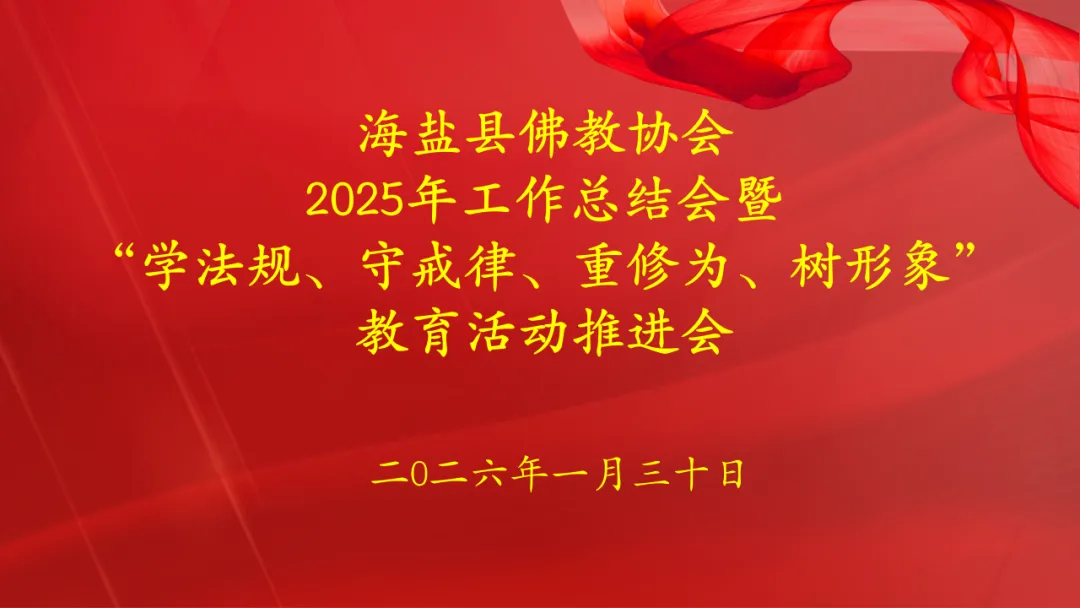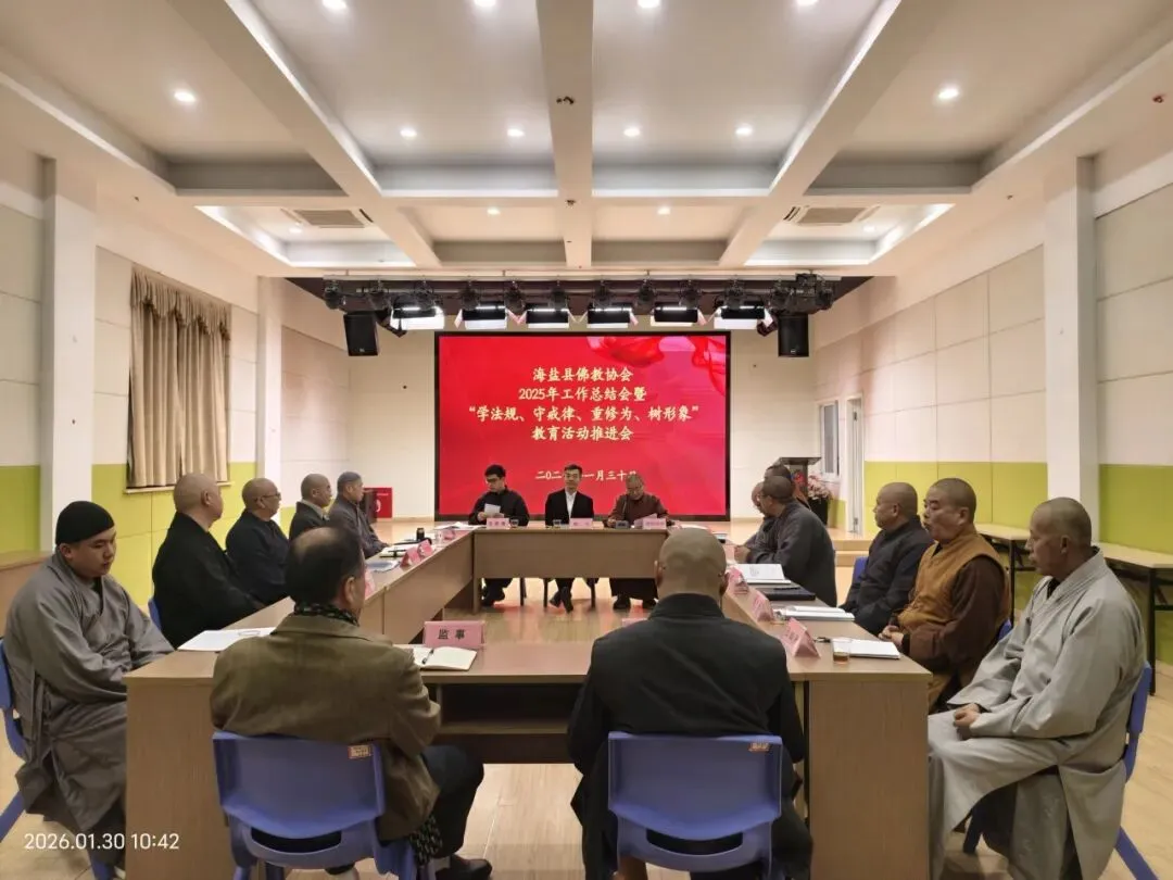 2026年1月30日上午,海盐县佛教协会2025年工作总结会暨“学法规、守戒律、重修为、树形象”教育活动推进会在佛协会议室召开。海盐县委常委、统战部部长胡飞,县委统战部副部长、民宗局副局长范郭真应邀出席会议并作指导讲话。县佛协会长晓明法师,监事长风悦法师,副会长净念法师、常心法师、可如法师以及全体理事、监事和寺院负责人参加会议。会议由县佛协会长晓明法师主持。
