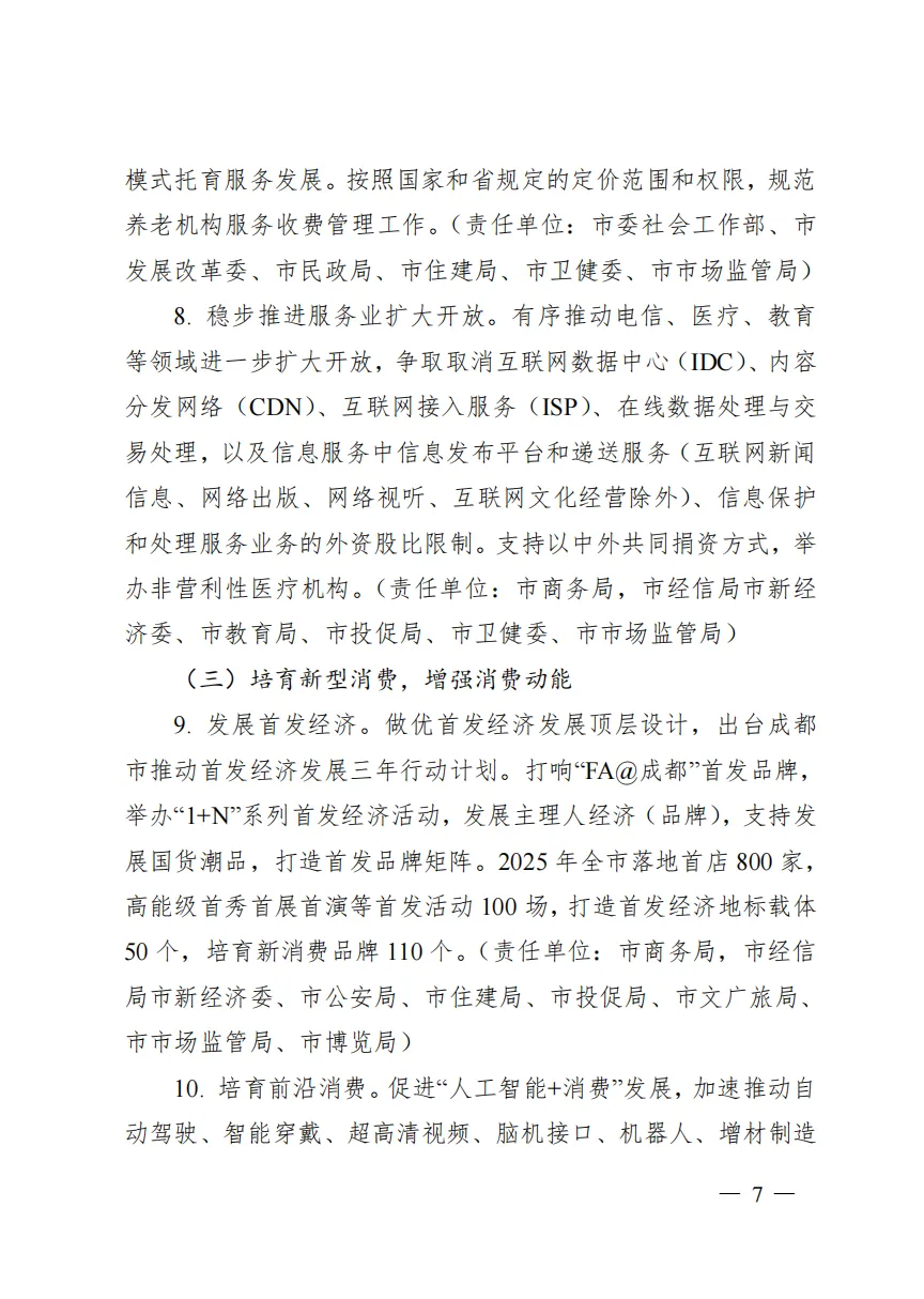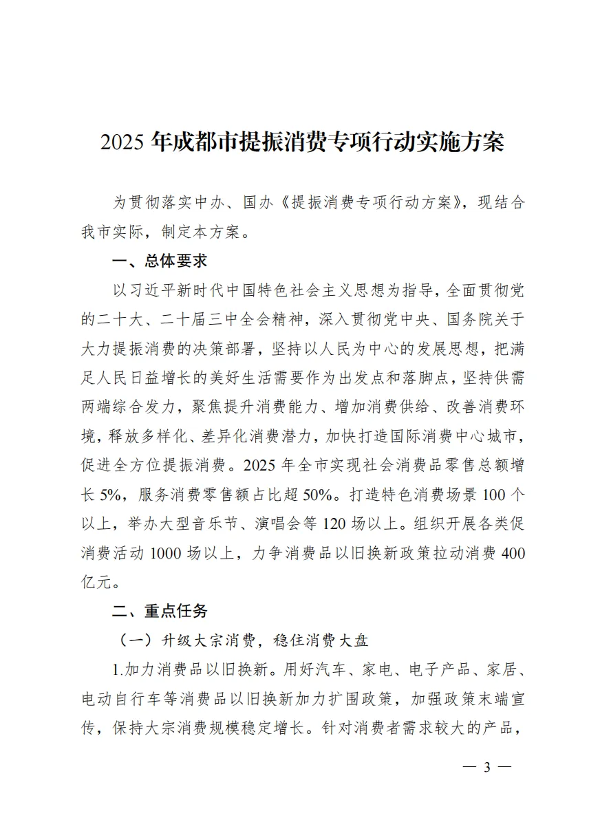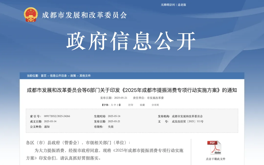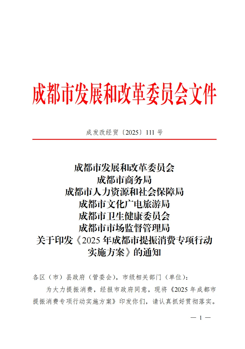 近日,成都市发展和改革委员会联合市商务局、市人社局、市文广旅局、市卫健委、市市场监管局等多部门,正式印发《2025年成都市提振消费专项行动实施方案》。