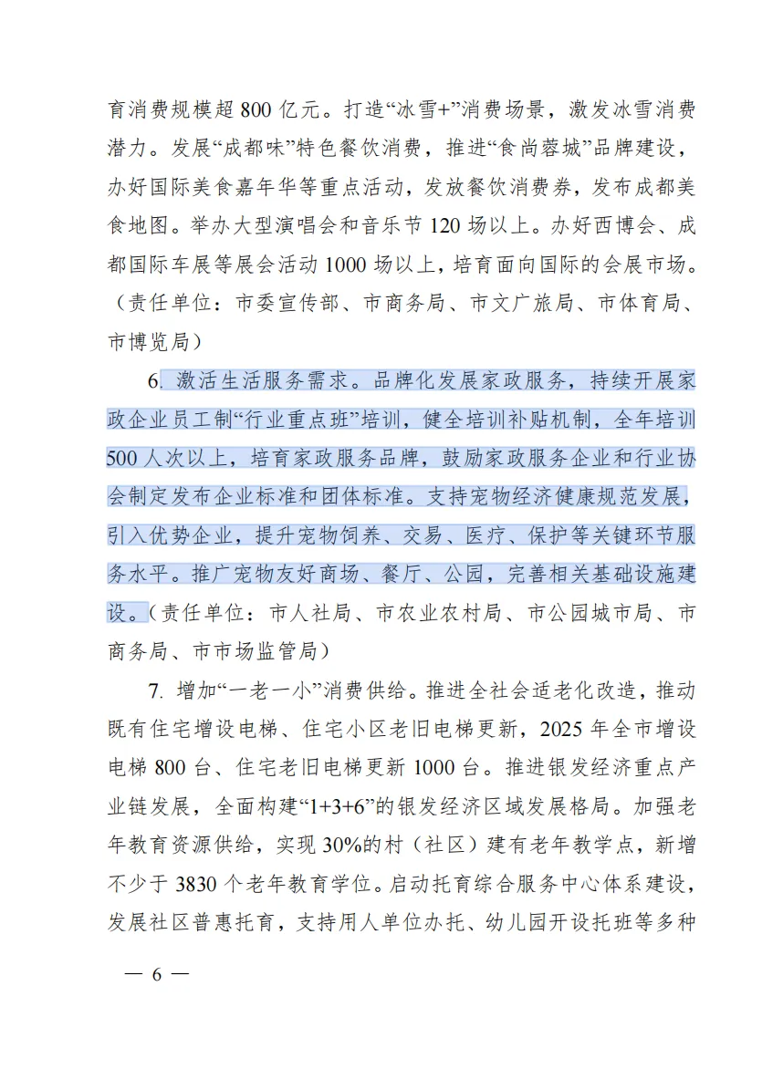 6. 激活生活服务需求。品牌化发展家政服务……支持宠物经济健康规范发展,引入优势企业,提升宠物饲养、交易、医疗、保护等关键环节服务水平。推广宠物友好商场、餐厅、公园,完善相关基础设施建设。【责任单位:市人社局、市农业农村局、市公园城市局、市商务局、市市场监管局】