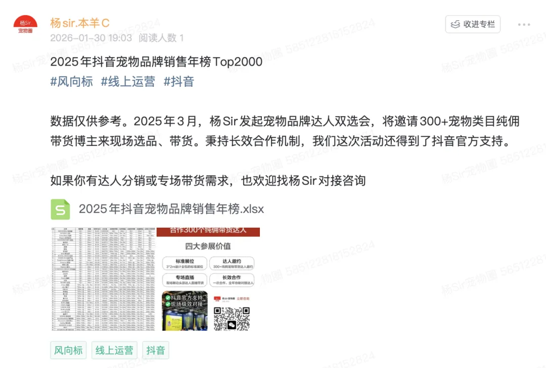 杨Sir还汇总了一份抖音宠物品牌销售年榜Top2000,为想在宠物赛道带货的品牌提供销售参考,已同步至下方「杨Sir宠物圈」知识星球加入杨Sir会员(知识星球)