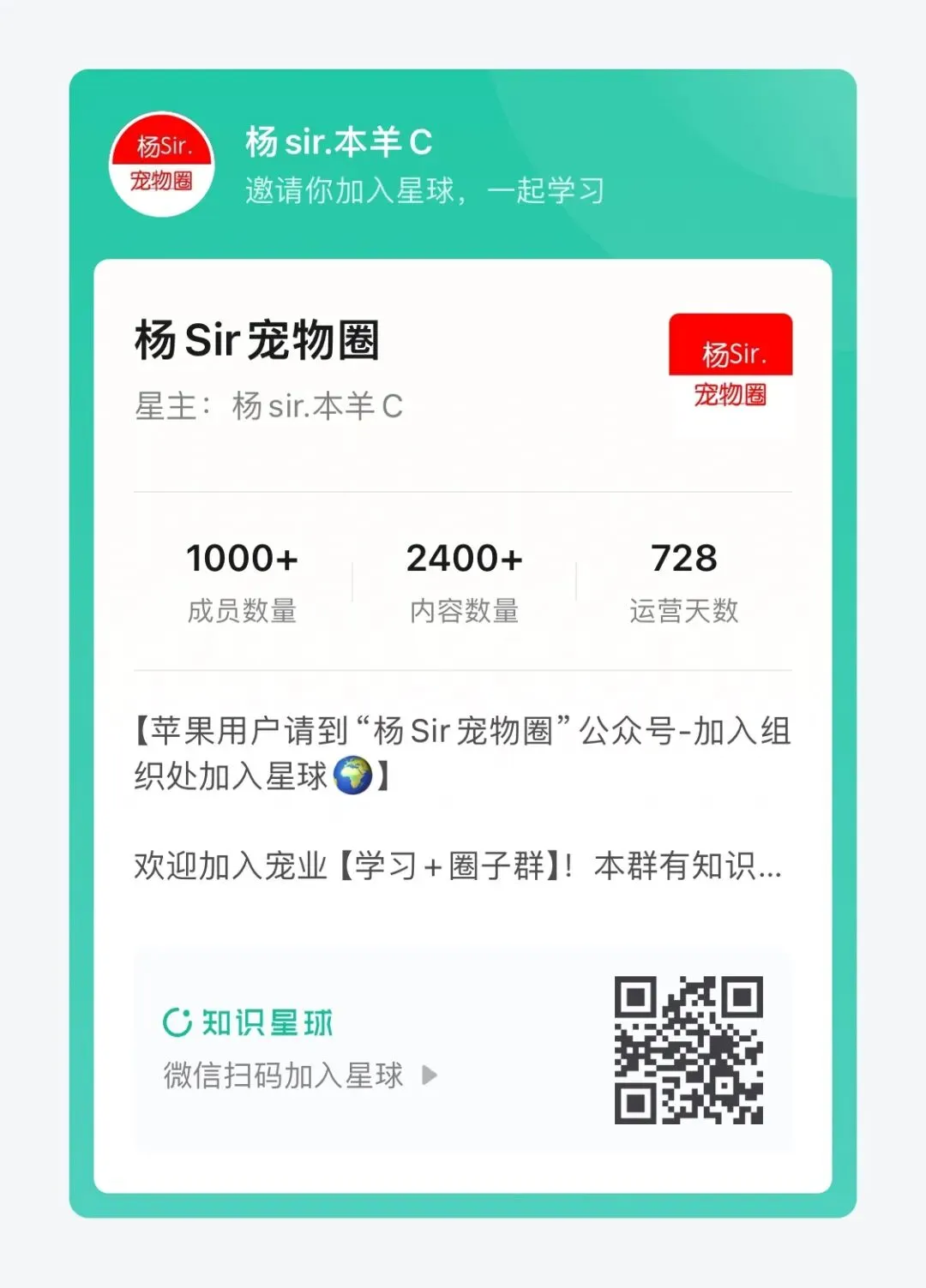 这是杨Sir在私域开辟的第二战场,平常不便对外分享的宠物行研、细分数据、运营干货、操盘手分享都会同步到这个「宠业学习+圈子群」,如果如果你有兴趣加入,可下图扫码,加入知识星球「解锁宠业圈+与杨Sir及会员建联」等七大权益。