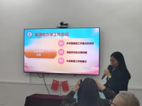 集团教研中心主任曾金意副校长首先作学期工作总结,从多维度梳理了集团化办学的亮眼成果:教研联动方面,通过“名师工作室+学科教研坊”模式,开展跨校教研活动,有效促进了各校教学经验互通。资源共享方面,搭建了集团资源平台,共享优质课件、作业设计等资源,推动成员校教学质量均衡提升。师资共建方面,组织骨干教师跨校支教、跟岗学习,助力青年教师快速成长。报告同时客观剖析了集团发展中存在的协同效率不足、特色活动打造薄弱等问题,为后续改进明确了方向。