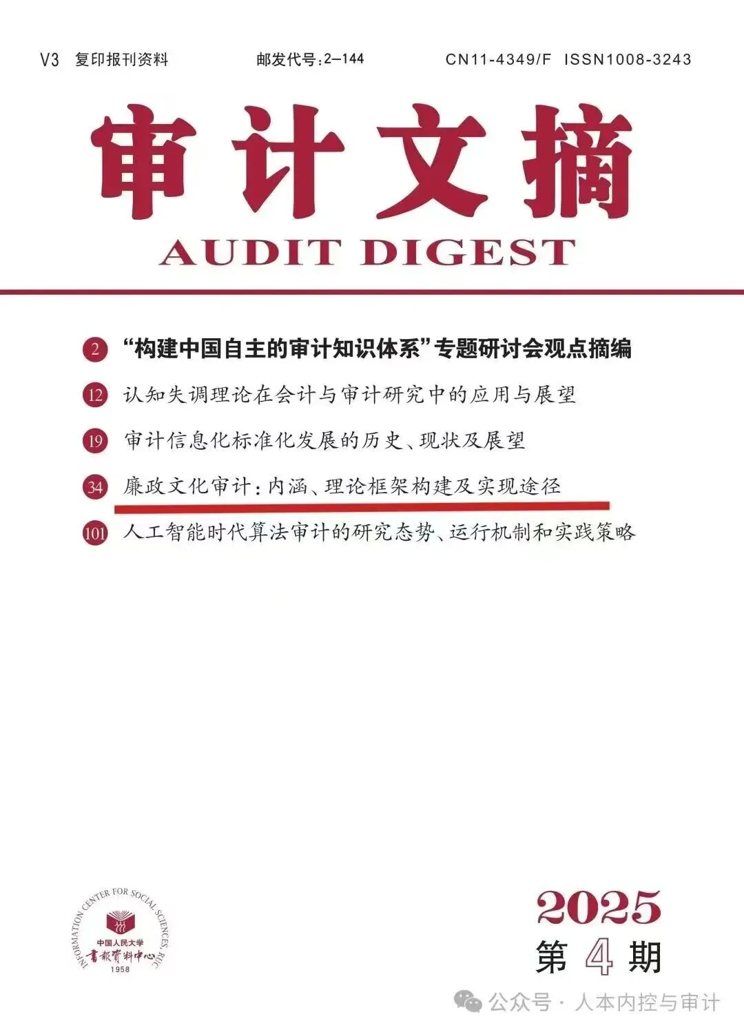 王海兵,赵芷玮,徐伟.廉政文化审计:内涵、理论框架构建及实现途径[J].商业会计,2025,(04):4-9.人大复印报刊资料《审计文摘》2025第4期全文转载