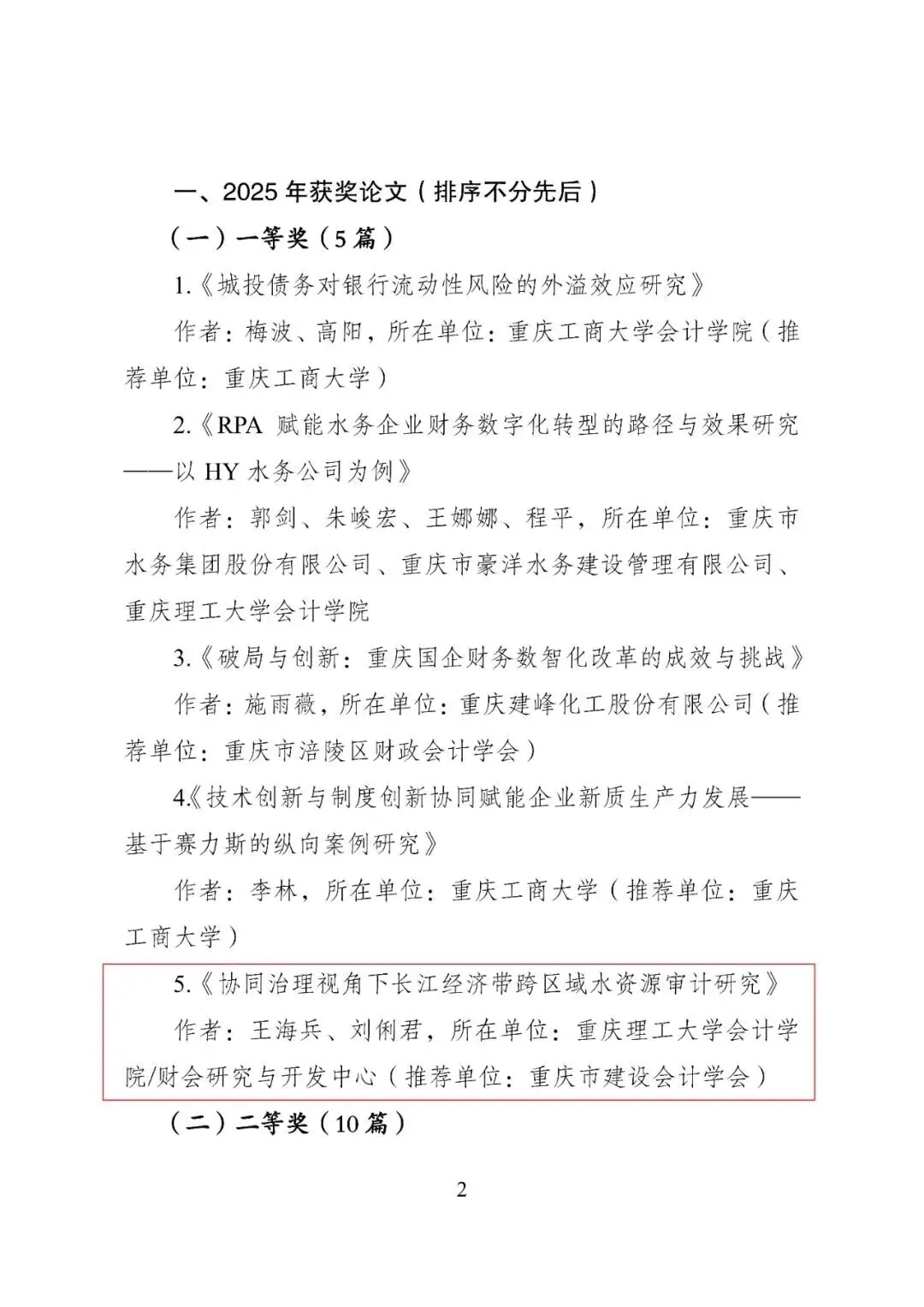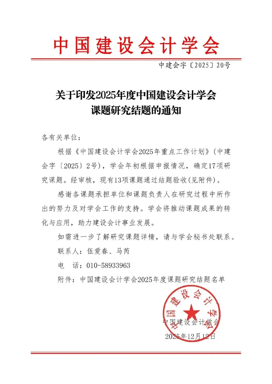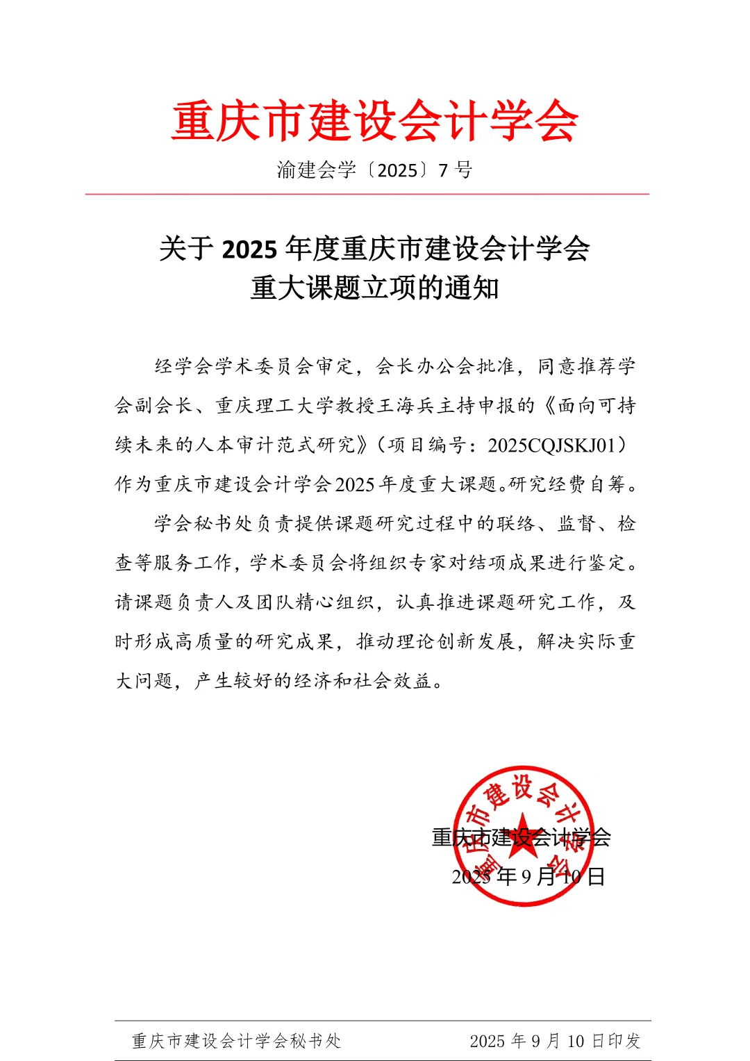 王海兵教授主持承担2025年度中国建设会计学会课题《“双碳”目标下建筑行业碳审计评价指标体系构建研究》,2025年12月结项;王海兵教授主持承担2025年度重庆市建设会计学会重大课题《面向可持续未来的人本审计范式研究》(项目编号:2025CQJSKJ01),在研;