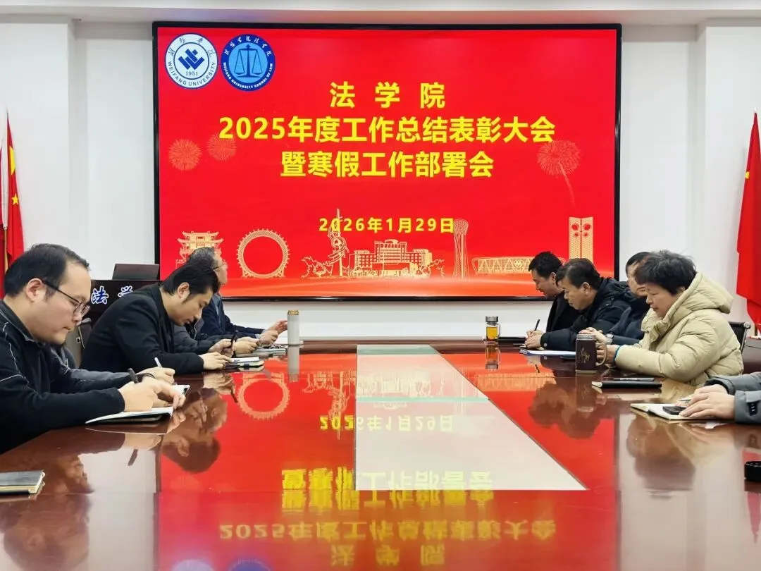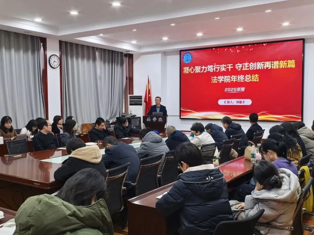 会议最后,学院党委书记刘德才作总结讲话。他从党的建设、教学科研、人才培养、社会服务、文体活动等多个维度,全面梳理和肯定了学院在2025年取得的主要成绩。同时,他也客观分析了当前学院发展过程中存在的短板与不足,强调要清醒认识面临的形势与任务。针对下一步工作,他强调,必须严守安全底线,扎实做好暑假及各项日常安全工作;要立足学院实际,紧密结合学校“1+4+N”发展战略,科学编制学院“十五五”规划;号召大家要以此次总结表彰为契机,勤学不辍,进一步增强责任感和使命感,充分利用寒假时间充电蓄能、谋划工作,以更加饱满的热情和更加务实的作风,共同谱写法学院发展新篇章。