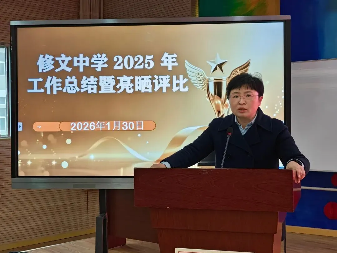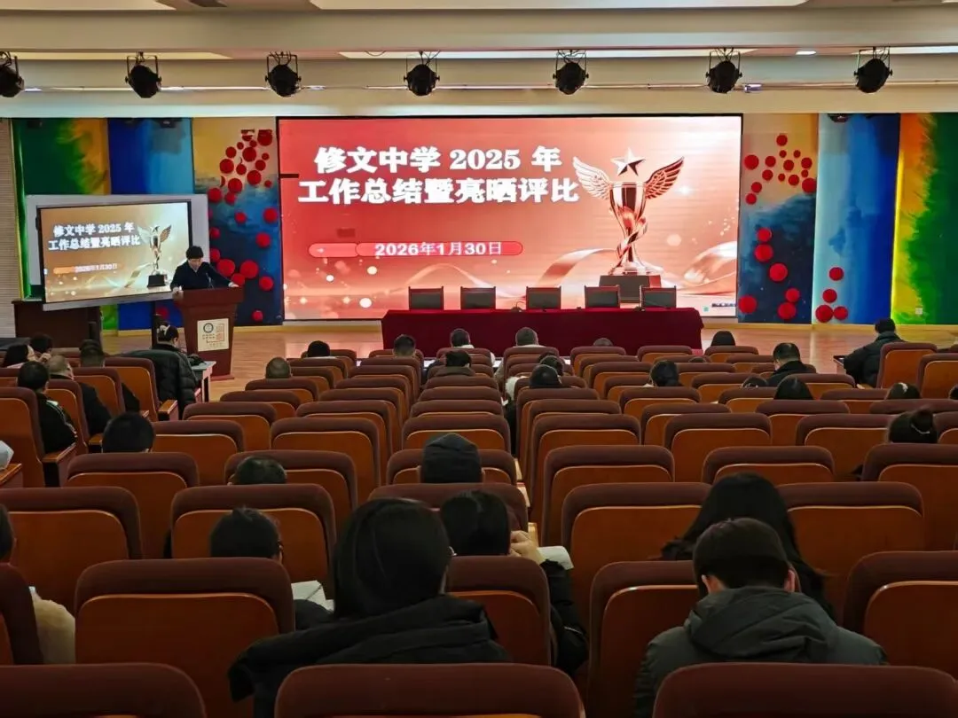 2026年1月30日14:30,修文中学全体教职工齐聚立言楼影视厅,召开2025年工作总结暨亮晒评比会议。会议首先开展各处室工作“亮晒”,集中展示2025年取得的工作成绩及亮点,促进部门间交流互鉴。随后,全体参会人员以无记名方式完成了对各处室工作的满意度问卷测评,通过民主评议推动管理效能与服务水平的持续提升。