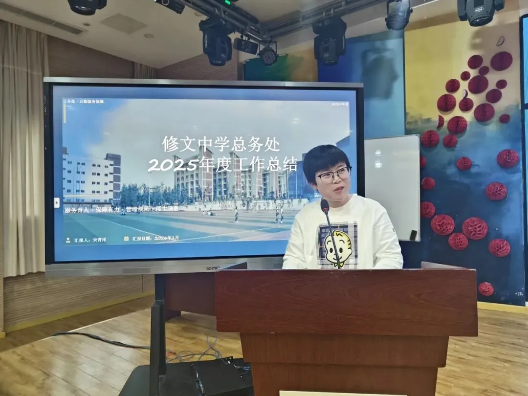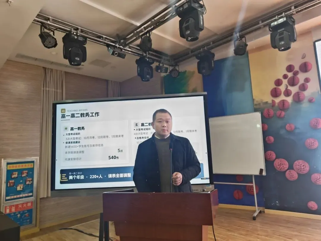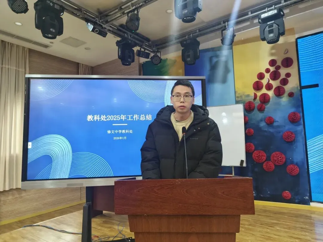 教导处陈俊主任围绕“规范管理、精准服务、提质增效”汇报全年工作。全年完成了学校考试、招生、课务安排等工作,以及顺利完成了上级安排各类考试。教导处计划在2026年持续做好理科提质工作,并充分利用好图书资源利用率,积极推广阅读活动,还要加强美育考核与教学资源库建设。