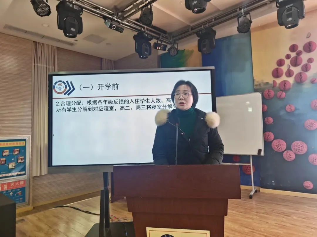 寄宿办胡远梅主任详细汇报了宿舍管理的精细化流程,涵盖开学前的容量盘清与合理分配,到日常的安全排查、内务培训及生病关怀等环节。下学期将重点强化周期性安全检查、维修跟进及管理责任落实。