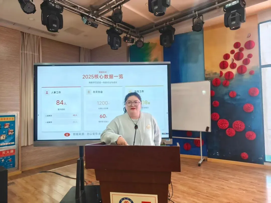 办公室吴晗主任通过数据展示全年工作:高效处理公文1200余份、组织会议60余场;助力84名教师成功晋升职称,创历史新高;运营学校公众号全年发文208篇,粉丝数量已超1.5万。同时以“假期逆行者”“超级步兵”等生动比喻,展现了团队的责任担当与多技能发展。