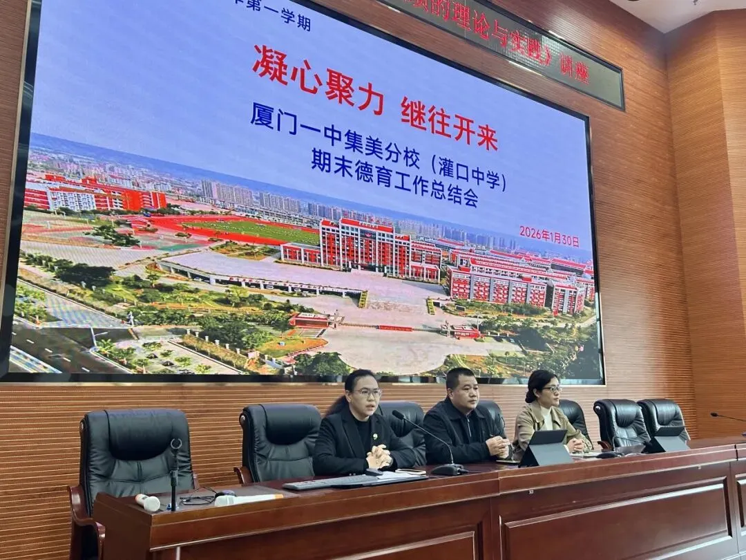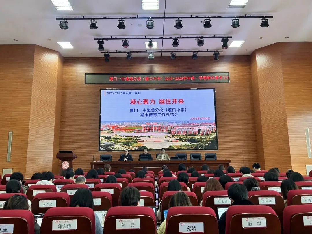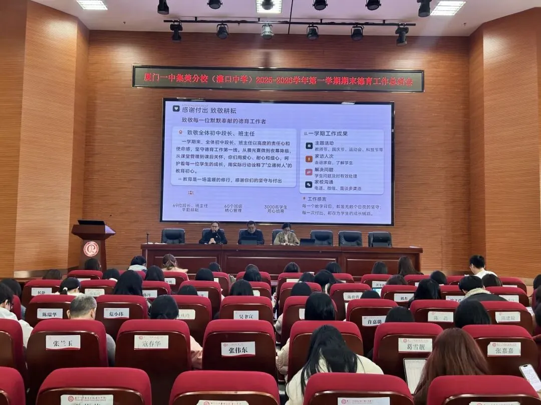 2026年1月30日,厦门一中集美分校(灌口中学)初中部召开2025-2026学年第一学期期末德育工作总结会,会议由德育科组织,全体初中部段长、班主任参会。会议全面回顾本学期德育工作成效,剖析现存问题,明确下学期发展方向,凝聚育人共识。