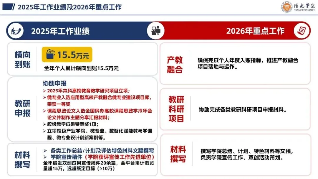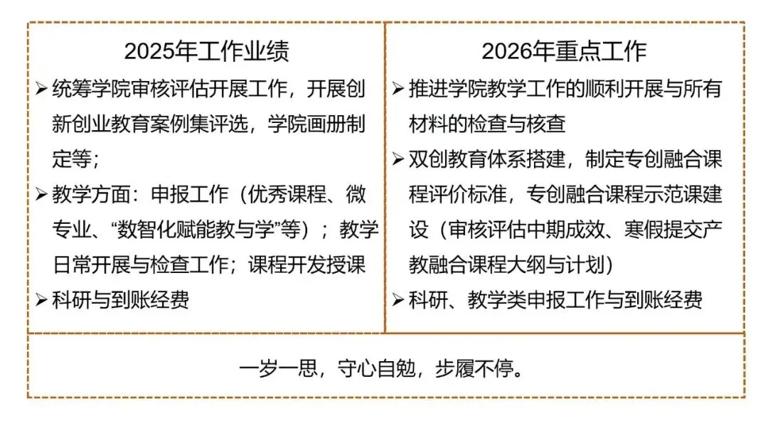 随后,学院全体教职工依次作个人总结汇报,围绕工作实绩、问题不足及2026年计划展开阐述,展现出务实担当、开拓进取的良好风貌。