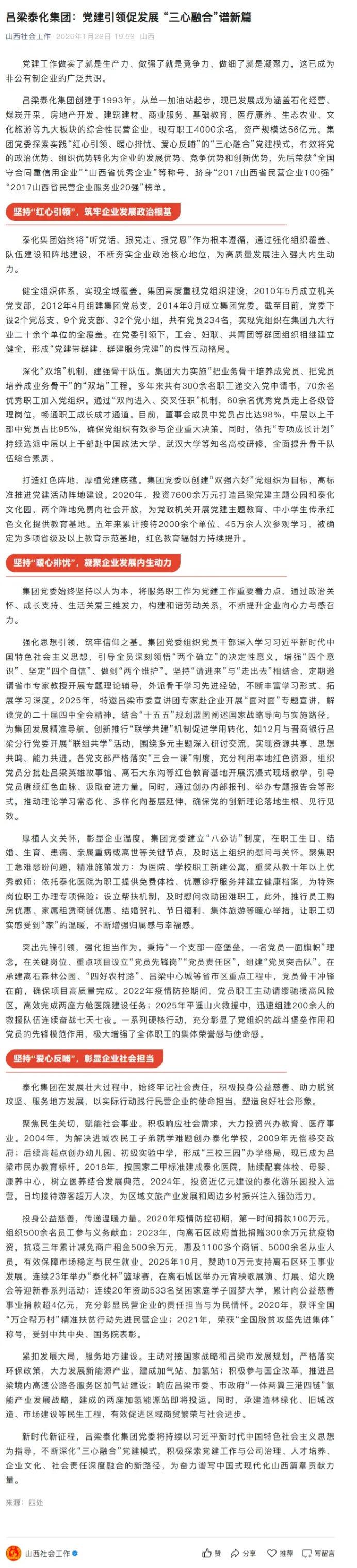 近日,“山西社会工作”微信公众号以《吕梁泰化集团“三心融合”党建树标杆》为题,对吕梁泰化集团党建经验做法进行专题报道。