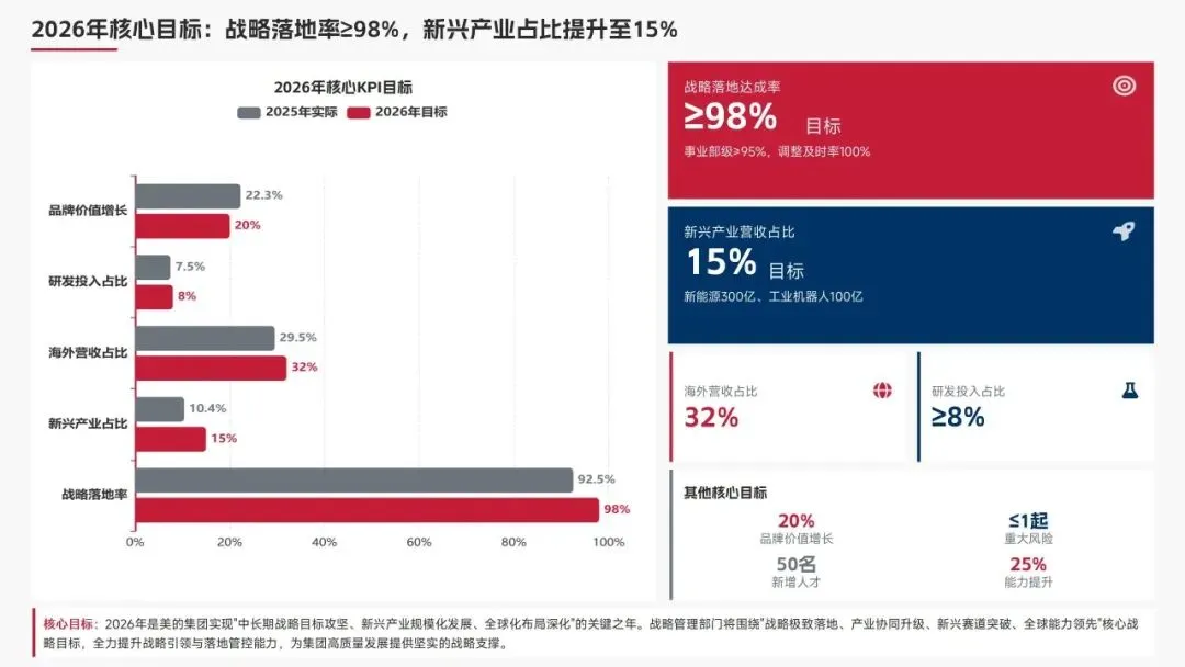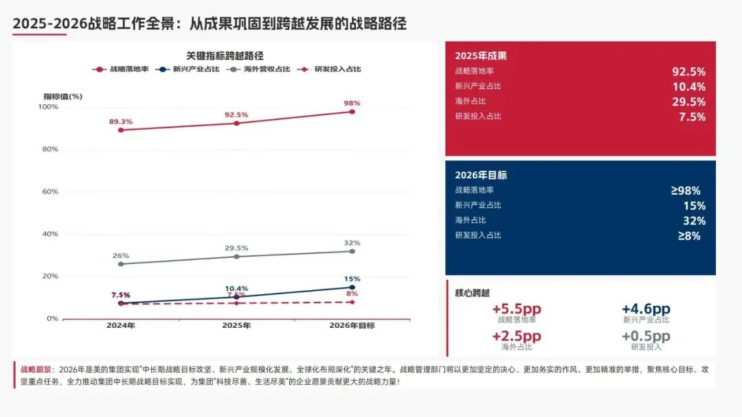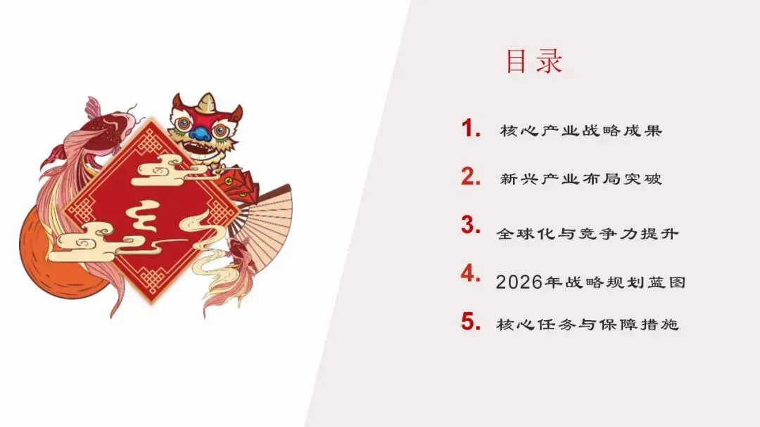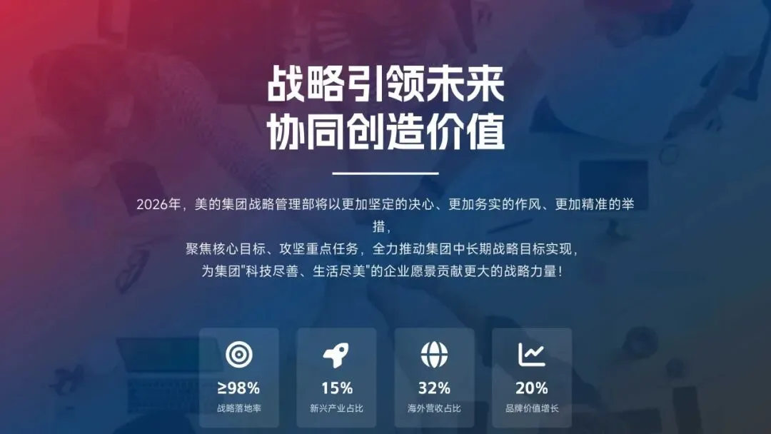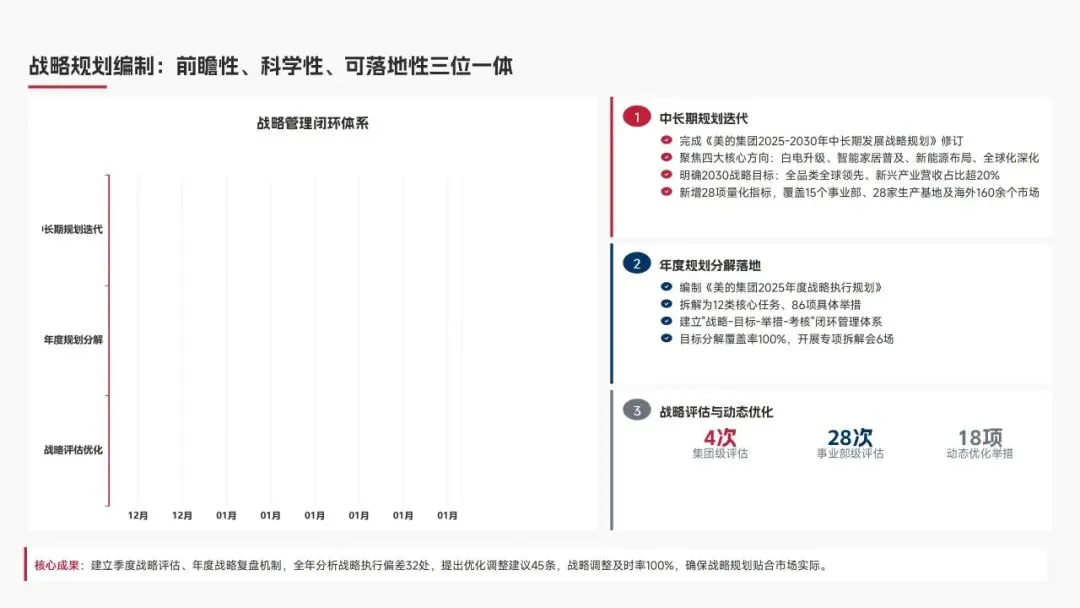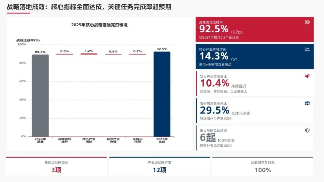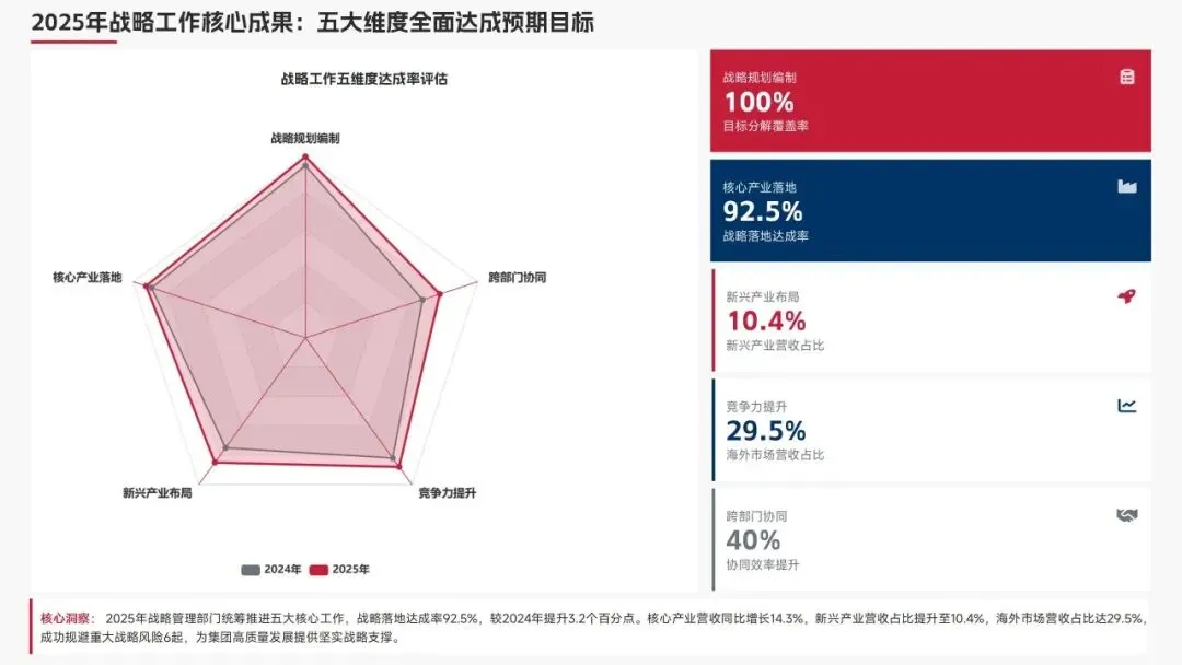 2025年美的关联集团战略管理部门紧紧围绕集团“科技驱动、全域协同、品类领先、全球布局”核心发展战略,统筹推进战略规划编制、核心产业战略落地、新兴产业布局、战略竞争力提升、跨部门协同管控五大核心工作,全年完成集团级战略规划3项、产业级战略方案12项,推动核心战略落地达成率92.5%,核心产业营收同比增长14.3%,新兴产业营收占比提升至10.4%,海外市场营收占比达29.5%,成功规避重大战略风险6起,为集团高质量发展提供了坚实的战略引领与支撑。现将全年工作情况总结如下,并对2026年工作作出全面规划。