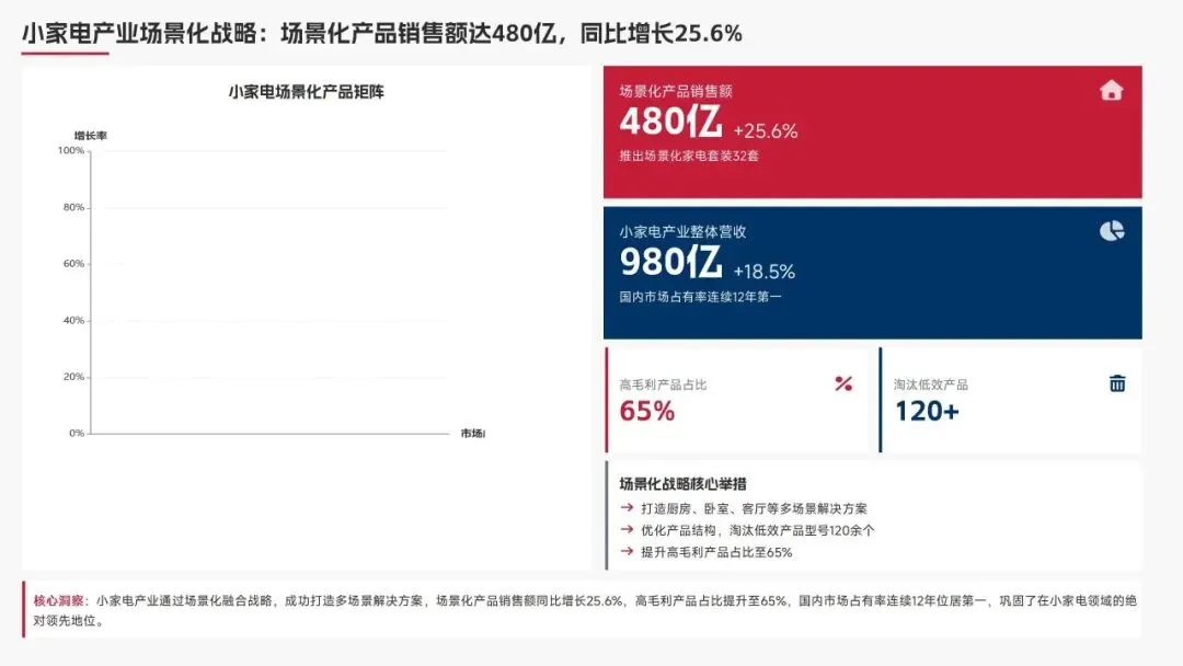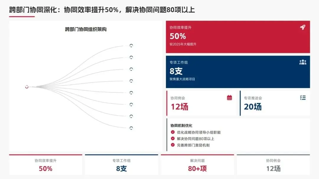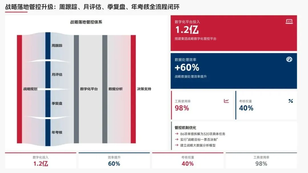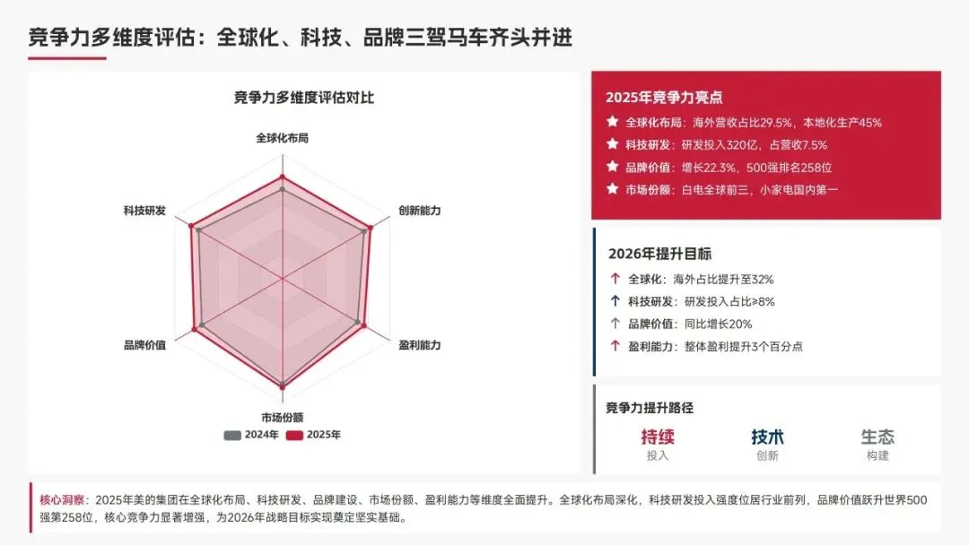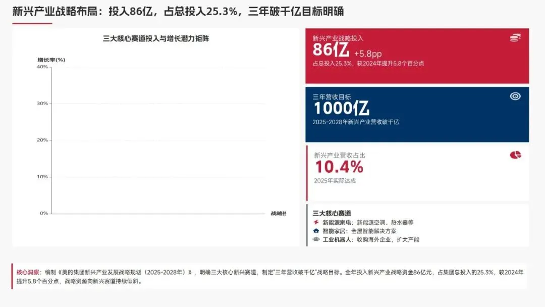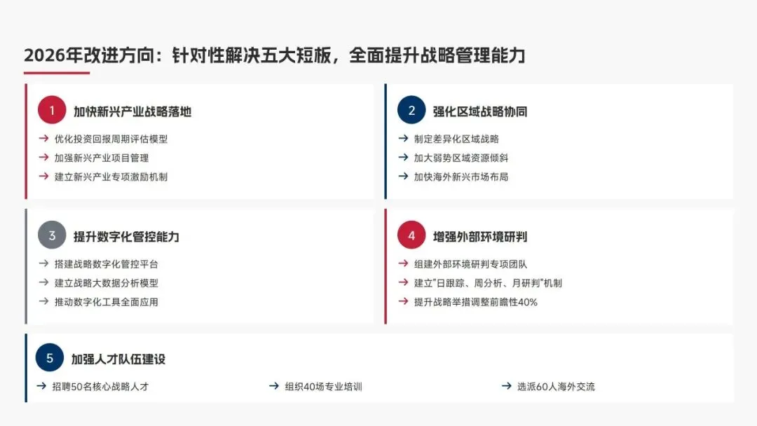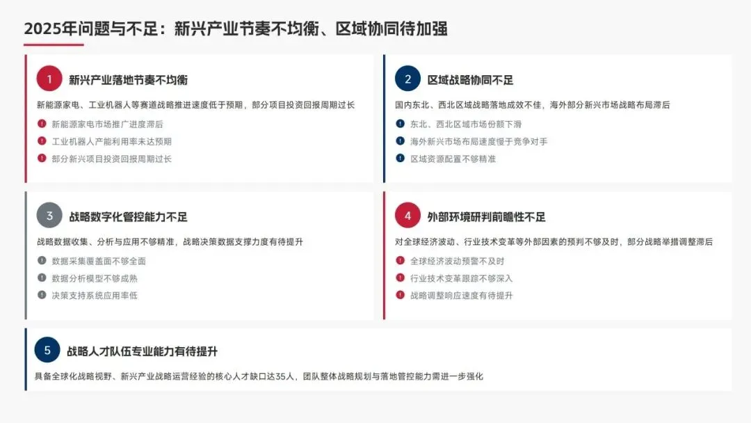 2025年美的关联集团战略管理部门紧紧围绕集团“科技驱动、全域协同、品类领先、全球布局”核心发展战略,统筹推进战略规划编制、核心产业战略落地、新兴产业布局、战略竞争力提升、跨部门协同管控五大核心工作,全年完成集团级战略规划3项、产业级战略方案12项,推动核心战略落地达成率92.5%,核心产业营收同比增长14.3%,新兴产业营收占比提升至10.4%,海外市场营收占比达29.5%,成功规避重大战略风险6起,为集团高质量发展提供了坚实的战略引领与支撑。现将全年工作情况总结如下,并对2026年工作作出全面规划。