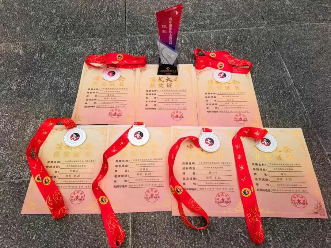 1. 集体赛:在 2025 深圳杯太极拳比赛中,集体 32 式太极剑三等奖;广东省第四届演武大会(深圳赛区)集体 42 式太极剑斩获二等奖;“激情全运会,活力大湾区”深圳市健身气功站点联赛中,马王堆导引术项目获三等奖;深港澳地区太极拳比赛集体 42 式太极剑获二等奖;第二届“亚洲太极拳日”暨全国太极拳健身站点网络赛集体42 式太极剑再获二等奖,充分彰显团队协作实力。