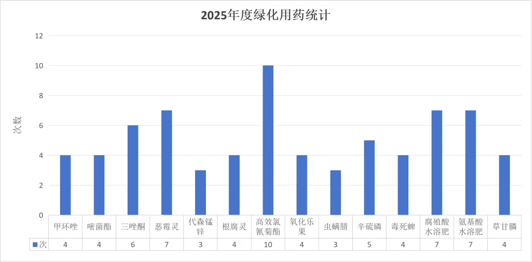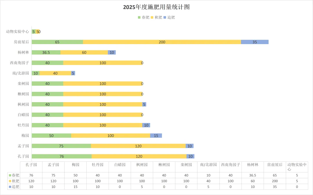 全年实施园林施肥2轮(春肥、秋肥),追肥3次;针对长势欠佳苗木实施点状追肥19处。累计施用肥料约95袋,其中春肥约30袋(复合肥26袋、有机肥4袋),秋肥约45袋(复合肥40袋、有机肥5袋)。