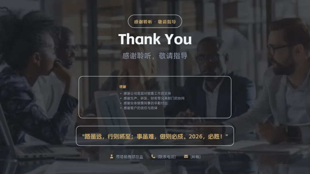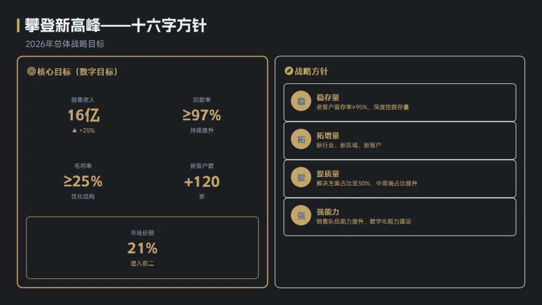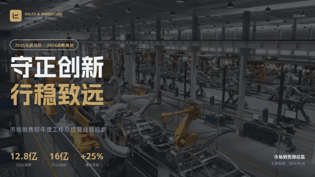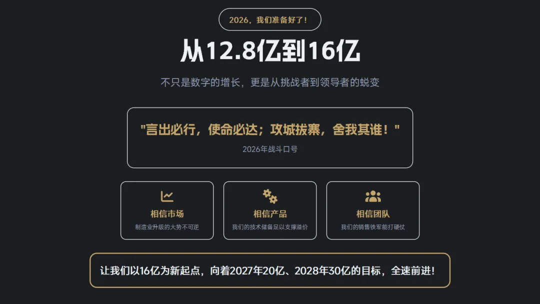 从12.8亿到16亿,不只是数字的增长,更是从挑战者到领导者的蜕变。我们的战斗口号是:"言出必行,使命必达;攻城拔寨,舍我其谁!"我们相信市场:制造业升级的大势不可逆,智能化、国产替代的历史机遇就在眼前。我们相信产品:我们的技术储备足以支撑溢价,B系列和D系列代表了行业未来方向。我们相信团队:我们的销售铁军能打硬仗,连续超额完成业绩证明了我们的执行力。让我们以16亿为新起点,向着2027年20亿、2028年30亿的目标,全速前进!"路虽远,行则将至;事虽难,做则必成。2026,必胜!"