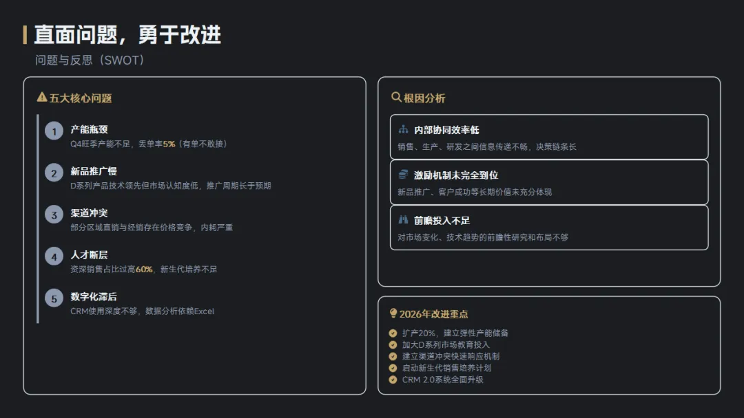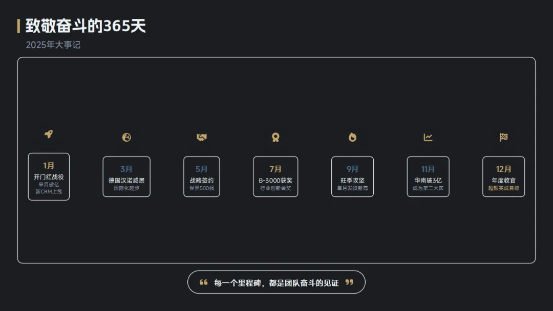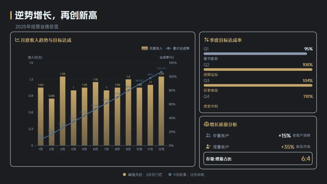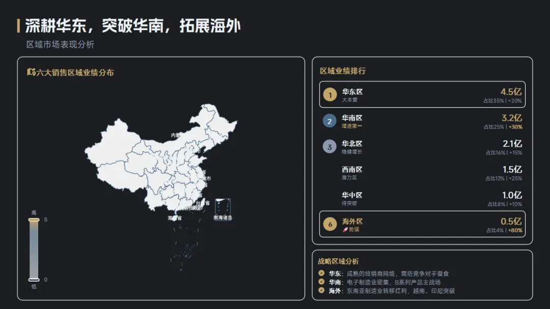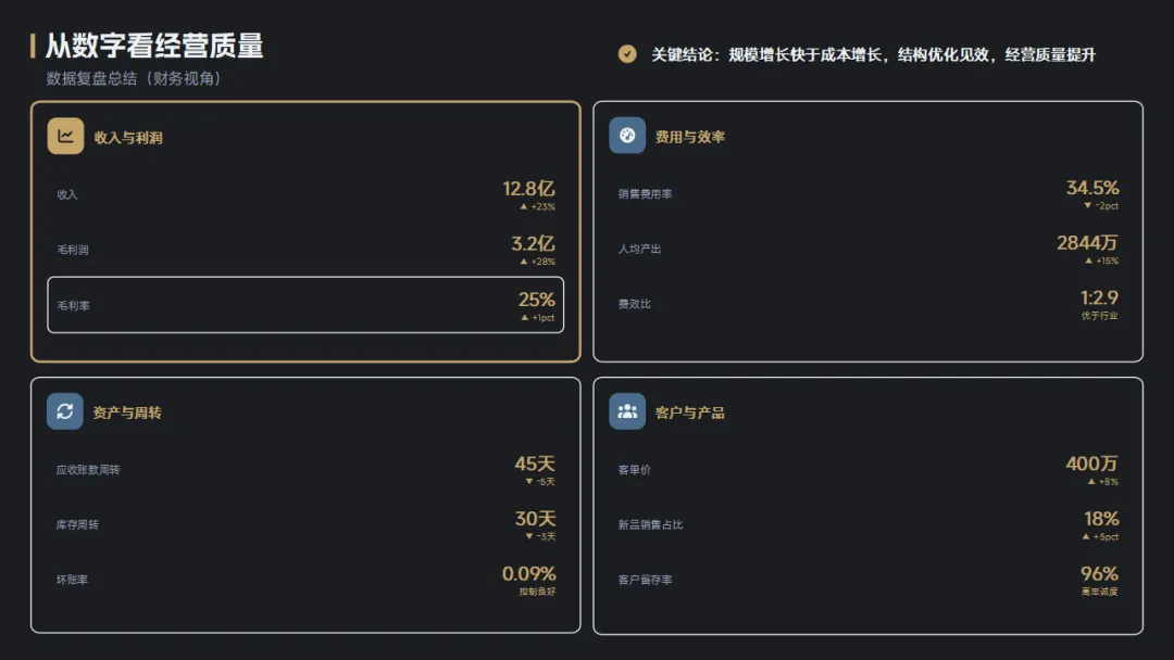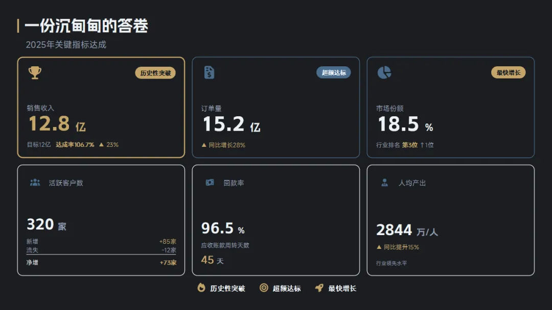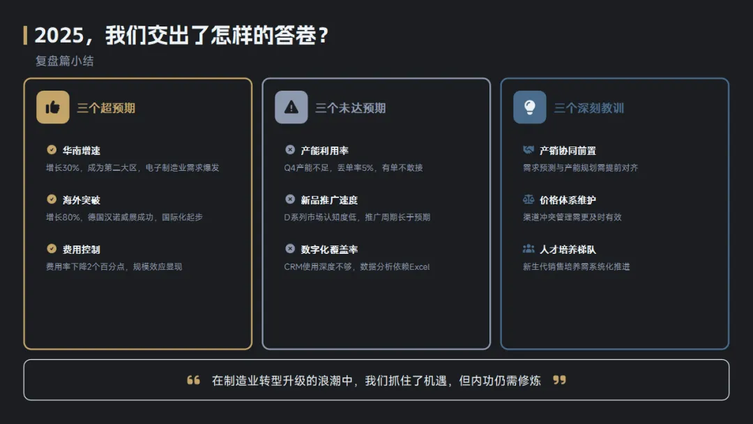 我们连续第3年获得公司年度"优秀部门"称号,并荣获"总裁特别奖——业绩突破奖"。8家客户为我们颁发了"优秀供应商"奖牌;我们还获得了行业媒体评选的"最佳服务品牌"称号。"成绩属于过去,奋斗成就未来"。这些荣誉是对我们的肯定,更是对2026年的鞭策。从财务视角看,我们的经营质量在2025年显著提升:收入与利润:收入12.8亿(+23%),毛利润3.2亿(+28%),毛利率25%(+1个百分点)。利润增速快于收入增速,说明结构在优化。费用与效率:销售费用率34.5%(-2个百分点),人均产出2844万(+15%),费效比1:2.9(优于行业)。资产与周转:应收账款周转45天(-5天),库存周转30天(-3天),坏账率0.09%(控制良好)。客户与产品:客单价400万(+8%),新品销售占比18%(+5个百分点),客户留存率96%。关键结论:规模增长快于成本增长,结构优化见效,经营质量提升。让我们用"三个超预期、三个未达预期、三个深刻教训"来总结2025年:- 华南增速超预期:增长30%,成为第二大区,电子制造业需求爆发被我们精准捕捉。