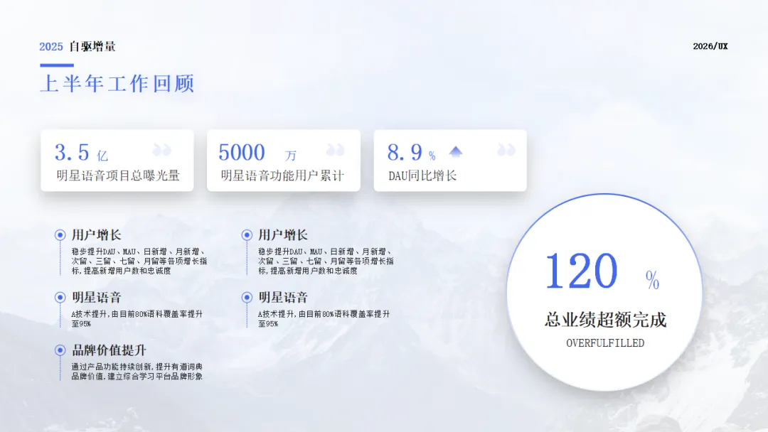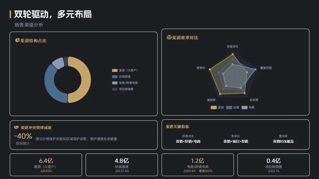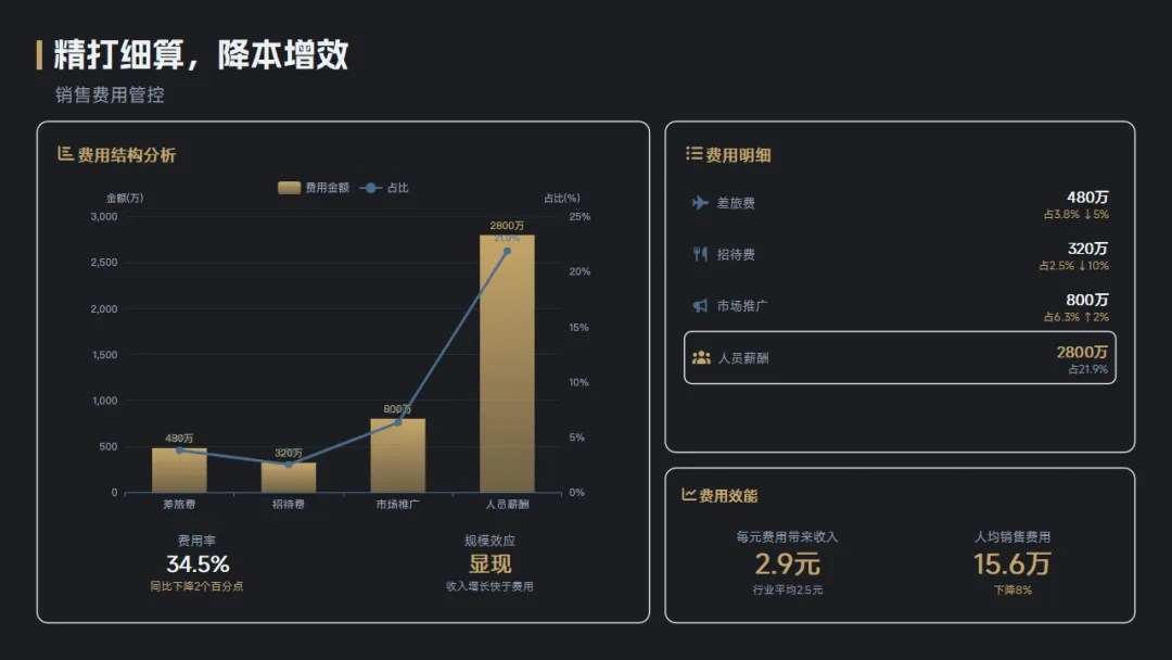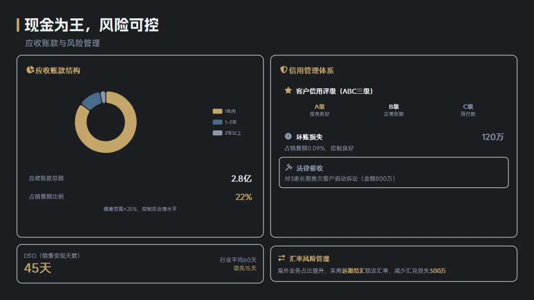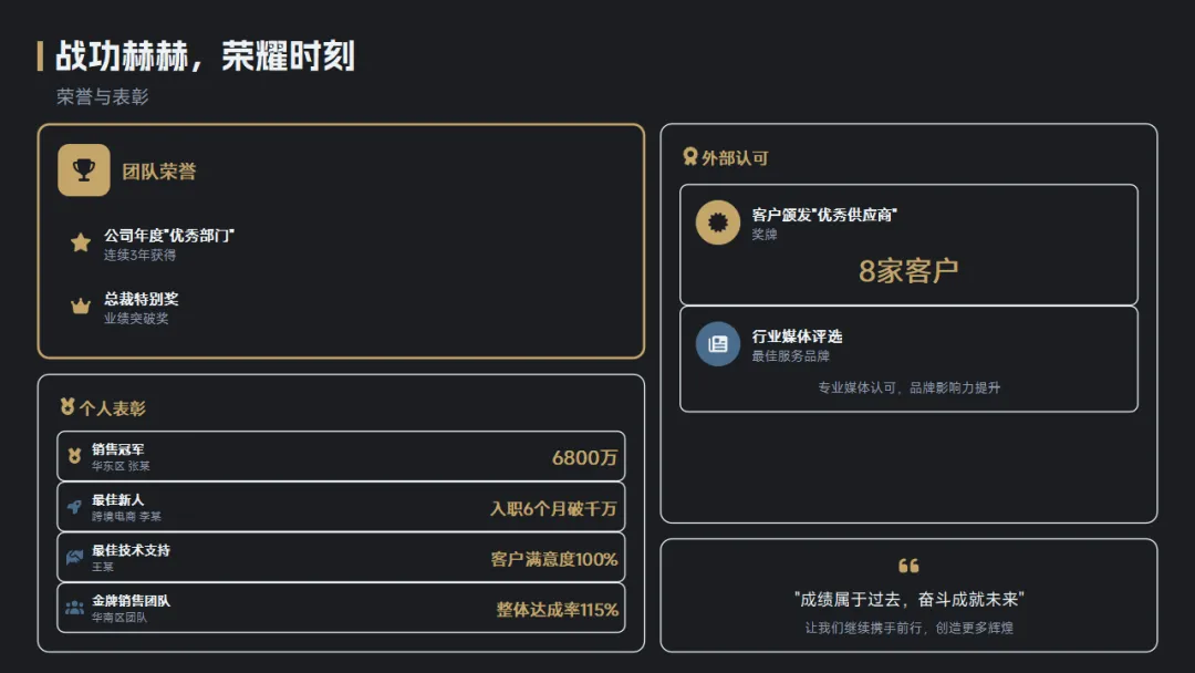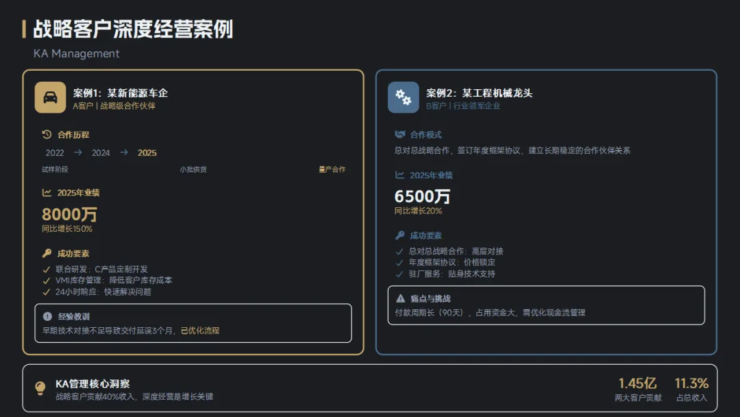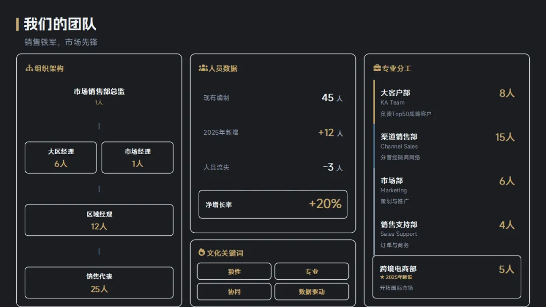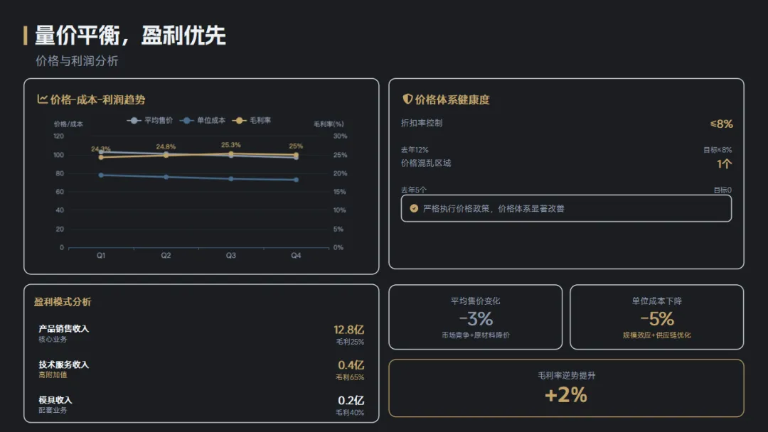 我们连续第3年获得公司年度"优秀部门"称号,并荣获"总裁特别奖——业绩突破奖"。8家客户为我们颁发了"优秀供应商"奖牌;我们还获得了行业媒体评选的"最佳服务品牌"称号。"成绩属于过去,奋斗成就未来"。这些荣誉是对我们的肯定,更是对2026年的鞭策。从财务视角看,我们的经营质量在2025年显著提升:收入与利润:收入12.8亿(+23%),毛利润3.2亿(+28%),毛利率25%(+1个百分点)。利润增速快于收入增速,说明结构在优化。费用与效率:销售费用率34.5%(-2个百分点),人均产出2844万(+15%),费效比1:2.9(优于行业)。资产与周转:应收账款周转45天(-5天),库存周转30天(-3天),坏账率0.09%(控制良好)。客户与产品:客单价400万(+8%),新品销售占比18%(+5个百分点),客户留存率96%。关键结论:规模增长快于成本增长,结构优化见效,经营质量提升。让我们用"三个超预期、三个未达预期、三个深刻教训"来总结2025年:- 华南增速超预期:增长30%,成为第二大区,电子制造业需求爆发被我们精准捕捉。