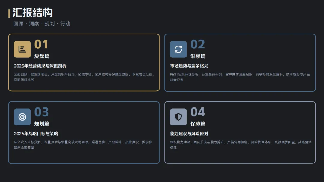 我是市场销售部总监。今天非常荣幸能够站在这里,向大家汇报我们部门2025年的经营成果以及2026年的战略规划。我汇报的主题是"守正创新,行稳致远"。首先请大家看大屏幕上的这几个数字:12.8亿,这是我们2025年实际达成的销售收入;16亿,这是我们为2026年设定的挑战目标;25%,这是我们明年要实现的增长幅度。在正式开始汇报之前,请允许我代表市场销售部全体45名同事,向一直以来支持我们工作的公司领导、兄弟部门以及广大客户,表示最诚挚的感谢!首先,我想向大家介绍一下我们这支团队。我们自称为"销售铁军,市场先锋",这不仅仅是一个口号,更是我们的行为准则和价值追求。从组织架构来看,我们实行的是"扁平化+专业化"的管理模式。在我的直接管理下,设有6位大区经理,他们分别负责六大销售区域;1位市场经理,统筹品牌建设和市场推广;12位区域经理,作为一线作战的指挥官;以及25位销售代表,他们是我们冲锋陷阵的勇士。在人员数据方面,2025年对我们来说是快速扩张的一年。年初我们定编是45人,全年新增入职12人,同时因为优胜劣汰和正常流动,减少3人,净增长率达到20%。这个增长率既体现了公司对我们部门的资源倾斜,也反映了市场对人才的渴求。第一个是"狼性"。狼性不是不讲道理的野蛮,而是一种敏锐的嗅觉、不屈不挠的进攻精神和群体奋斗的意识。在2025年激烈的市场竞争中,正是这种狼性文化让我们抓住了每一次机会。第二个是"专业"。B2B销售不是简单的喝酒吃饭,而是技术、商务、供应链、金融等多维度的专业能力的综合体现。我们要求每一位销售人员都要成为行业专家。第三个是"协同"。销售不是孤军奋战,我们需要生产、研发、财务、物流等所有兄弟部门的支持。我们提倡"内部求同存异,外部统一口径"的协同文化。第四个是"数据驱动"。在数字化时代,直觉和经验依然重要,但数据更加重要。我们要求每一个决策都要有数据支撑,每一次拜访都要有记录,每一个商机都要有分析。为了更好地服务不同类型的客户,我们实行了专业化分工:大客户部(KA Team)现有8人,他们负责我们Top 50的战略客户维护与开发。这些客户贡献了公司40%以上的收入,是我们必须死守的阵地。渠道销售部有15人,他们分管全国的经销商网络。在制造业领域,经销商依然是触达中小客户最有效的方式。市场部有6人,他们不是传统的"花钱部门",而是"投资部门",负责策划、推广、品牌建设和线索生成。销售支持部有4人,他们是销售的"大后方",负责订单处理、商务谈判支持、合同管理和客户投诉处理。特别值得一提的是,我们在2025年新设立了跨境电商部,目前编制5人。虽然这个部门现在还很小,但他们是我们的"国际化种子",肩负着开拓国际市场的重任。接下来,让我们用数据说话,看看2025年我们交出了一份怎样的答卷。我们用了三个词来概括2025年的业绩表现:历史性突破、超额达标、最快增长。首先是销售收入达成12.8亿元,而我们的年度目标是12亿元,达成率106.7%,同比增长23%。这不仅仅是数字的增长,更重要的是,这是在行业整体增速放缓的大环境下实现的逆势增长。12.8亿意味着我们创造了公司成立以来的历史新高,标志着我们正式跨入了"十亿俱乐部"。在订单量方面,我们全年新签订单15.2亿元,同比增长28%。订单增速快于收入增速,这为我们2026年的业绩释放奠定了坚实的基础。更重要的是,这些订单的质量很高,战略性产品和解决方案的占比显著提升。在市场份额方面,我们从行业第4位攀升至第3位,市场份额提升至18.5%。在存量博弈的市场中,排名每上升一位都极其困难,这需要我们从竞争对手手中抢夺客户。这个"↑1位"的背后,是无数次激烈的竞标和艰苦的谈判。在客户数量方面,我们全年活跃客户数达到320家,净增73家(新增85家,流失12家)。客户留存率达到96%,远超行业平均水平。这意味着我们不仅吸引了新客户,更重要的是留住了老客户。在回款率方面,我们实现了96.5%的年度回款率,应收账款周转天数控制在45天。在制造业普遍面临账款回收难的情况下,这个指标体现了我们客户结构的优质和信用管理的严格。在人均产出方面,我们达到了2844万元/人,同比提升15%,处于行业领先水平。这意味着我们不仅做大了蛋糕,还提升了组织效率。第一篇章是"复盘篇",我们将全面回顾2025年的经营成果,深度剖析产品线、区域市场、客户结构等多维度的数据,萃取成功经验,直面问题挑战。第二篇章是"洞察篇",我们将从PEST宏观环境、行业趋势、客户需求演变、竞争格局等角度,洞察市场机遇与威胁。第三篇章是"规划篇",我们将详细阐述2026年16亿收入目标的分解逻辑,以及存量深耕与增量突破的双轮驱动策略。第四篇章是"保障篇",我们将说明组织能力建设、风险管理体系和资源预算配置,确保战略落地。让我们先来复盘一下2025年的月度收入曲线。从趋势图可以看出,我们全年的收入呈现"前低后高、旺季爆发"的特征。第一季度受到春节假期的影响,加上年初市场观望情绪较重,我们达成了95%的目标,虽然看似没达标,但考虑到春节因素,这个成绩实际上符合预期。第二季度是我们发力的开始,达成率108%,超额达标,特别是3月份的"开门红"战役,单月破亿,为全年奠定了信心基础。第四季度是我们全年最精彩的收官,达成率110%,特别是12月份的冲刺,展现了团队强大的执行力和抗压能力。在增长