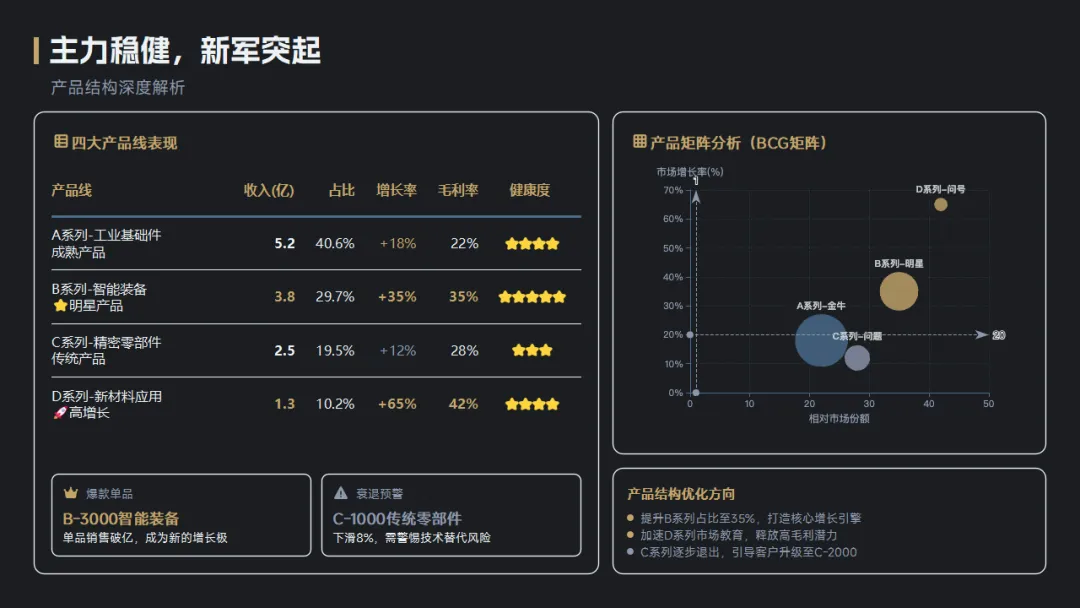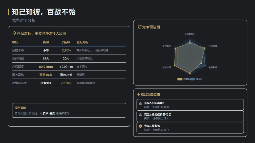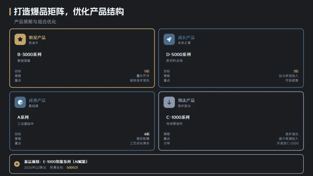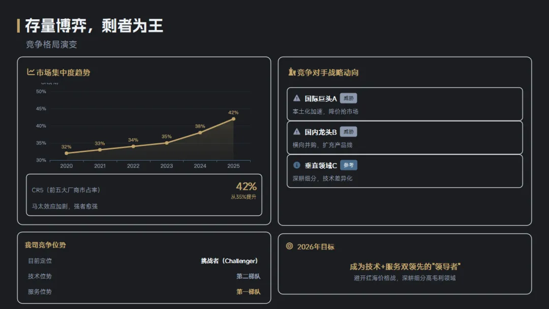 新能源(锂电设备、光伏)、半导体、医疗装备是我们锁定的三大新兴机会点。L1 基础需求(保健因素):性价比、质量稳定、及时交付,这是入场券,满足不了就会被淘汰。L2 期待需求(竞争因素):技术支持、定制能力、金融服务,这是同质化竞争区,满足这些才能参与竞争。L3 惊喜需求(愉悦因素):联合研发、数字化协同、ESG合规,这是差异化区,满足这些才能赢得客户忠诚。2023年:价格40% > 质量35% > 交期25%,价格是第一要素。2025年:技术35% > 成本30% > 服务25% > 价格10%,技术成为第一要素,价格权重大幅下降。客户痛点:客户面临技术升级压力,需要供应商提供"交钥匙"解决方案而非单一产品。CR5(前五大厂商市占率)从35%提升至42%,马太效应加剧,强者愈强。这意味着小厂商正在被挤出市场,头部企业之间的竞争更加激烈。我司目前的竞争位势:挑战者(Challenger)。技术位势处于第二梯队,但服务位势处于第一梯队。国内龙头B:横向并购,扩充产品线,也在挤压我们的空间。垂直领域C:深耕细分,技术差异化,这给我们提供了参考。2026年目标:我们要成为技术+服务双领先的"领导者",避开红海价格战,深耕细分高毛利领域。已成熟:精密加工技术,这是我司强项,必须保持领先。快渗透:物联网远程监控,客户需求快速增长,我们要加快布局。前沿期:AI预测性维护,这是差异化卖点,正在布局中。- 智能化升级套件:给传统产品加装传感器,溢价20%,提升附加值。