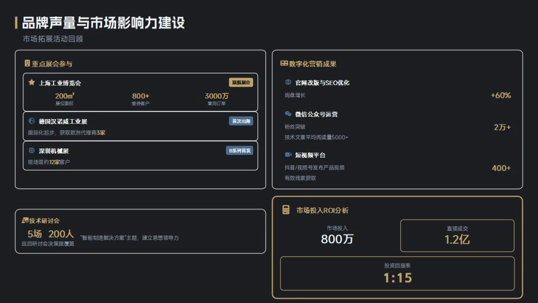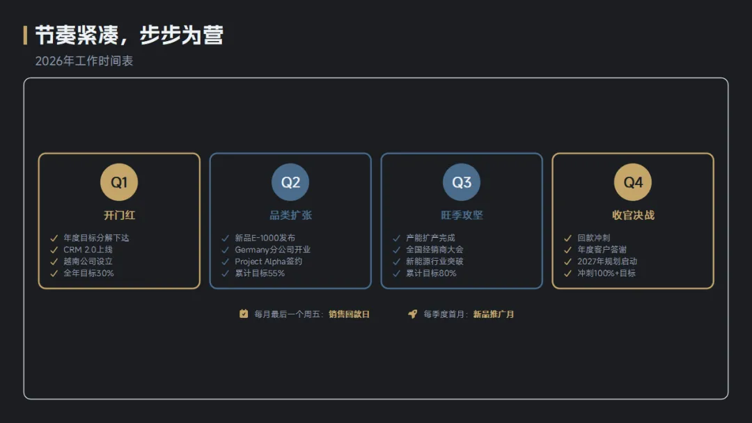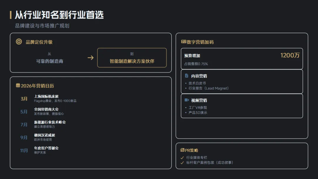 国内:突破华中(武汉、长沙),振兴东北老工业基地。国际:在越南设立本地化服务点,在德国建立欧洲分拨中心。数字化获客:SEO/SEM精准投放,目标线索2000条,转化率8%。生态合作:与自动化集成商结盟,与设计院共享客户资源,实现渠道共赢。大客户部扩编:从8人增至12人,新增4人专攻Top 50客户。建立行业销售:设立汽车行业组、3C电子行业组、新能源行业组,提升专业度。优胜劣汰:淘汰业绩后10%的经销商(3家),新增优质代理商(5家)。经销商赋能2.0:提供ERP系统、库存金融支持,提升经销商能力。标准品全面上线:入驻阿里1688、京东工业品,目标2亿。跨境电商:发力亚马逊B2B,建设独立站,目标5000万。组建解决方案销售团队(Solution Sales),攻坚大型工程项目,提供一站式服务。B-3000系列智能装备,目标5亿,策略是量价齐升,重点保持技术领先。D-5000系列新材料应用,目标2亿,策略是加大研发投入,重点进行市场教育。A系列工业基础件,目标6亿,策略是稳定规模,工艺优化降本。C-1000系列传统零部件,策略是逐步退出,减少资源投入,引导客户升级至C-2000。新品规划:2026年Q2推出E-1000智能系列(AI赋能),预售目标5000万。高端产品(D系列):撇脂定价,溢价30%,树立技术形象。主流产品(B系列):竞争定价,与竞品A保持5%以内价差。基础产品(A系列):渗透定价,以成本优势薄利多销,抢占份额。ROI计算器:展示客户使用我司产品后的效率提升数据和成本节约数据,用数据说话,证明价值。TCO对比手册:计算总拥有成本(Total Cost of Ownership),包括购买成本、使用成本、维护成本,证明"单价高但综合成本低"的价值主张。从"可靠的制造商"升级为"智能制造解决方案伙伴"。- 3月:上海国际机床展(旗舰展会,发布E-1000新品)。